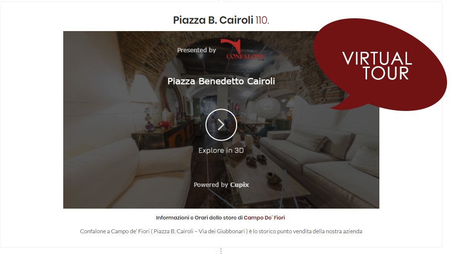 Abbiamo realizzato un tour virtuale per ogni store Confalone per aiutarvi a trovare il prodotto desiderato ancora più facilmente.