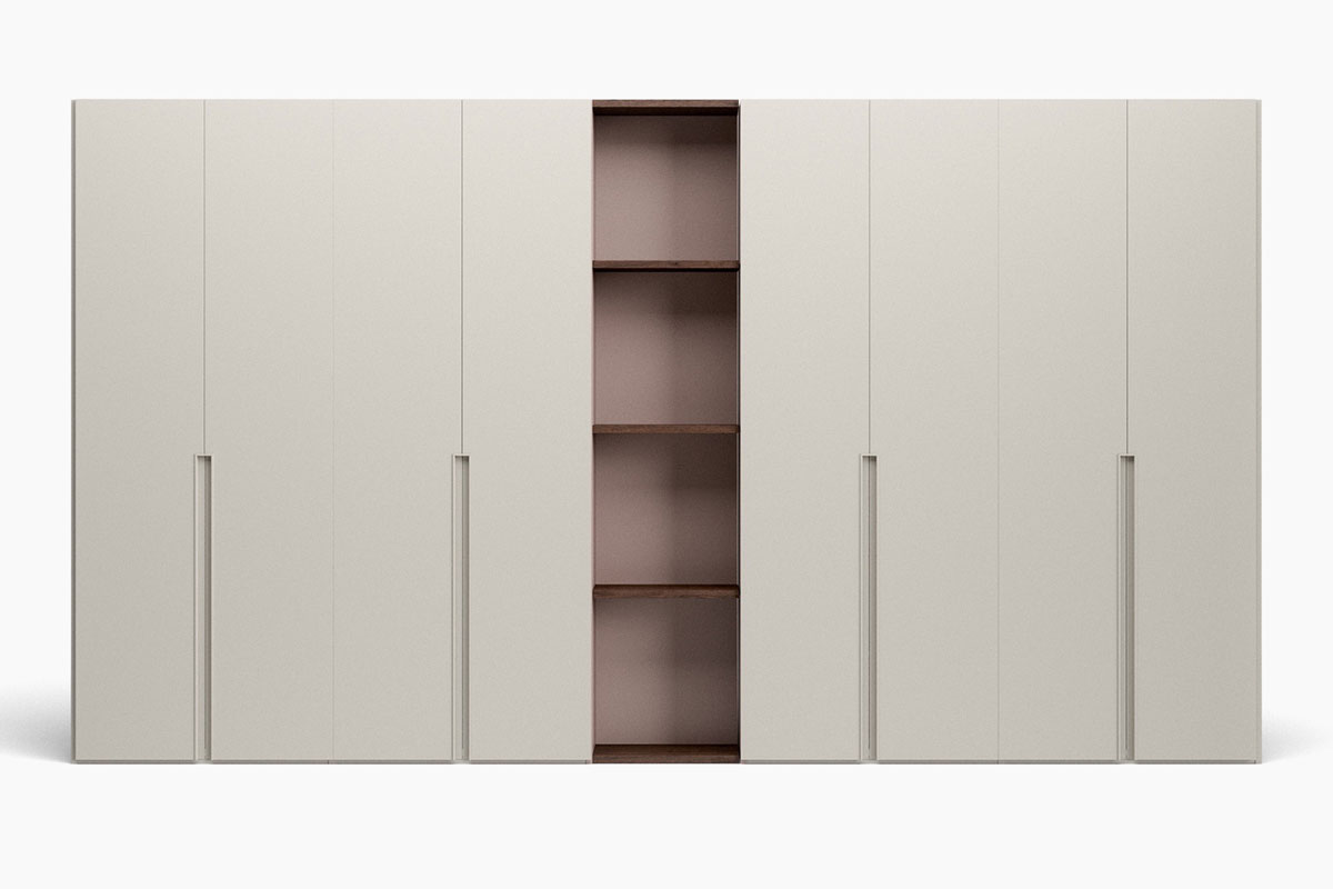 Questo modello di armadio a battente Confalone si distingue per il design pulito e la scanalatura che creata dalle ante a battente. Questo armadio può essere configurato a incasso o a muro e permette di creare terminali a libreria o passaggi corridoio.