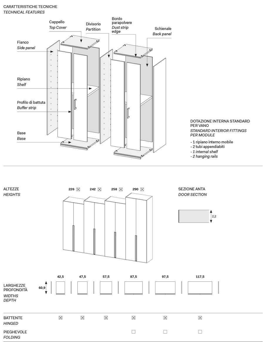 Scopri i materiali e i colori degli interni, degli esterni e i particolari per questo modello della Linea Armadi Confalone.