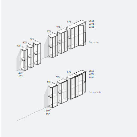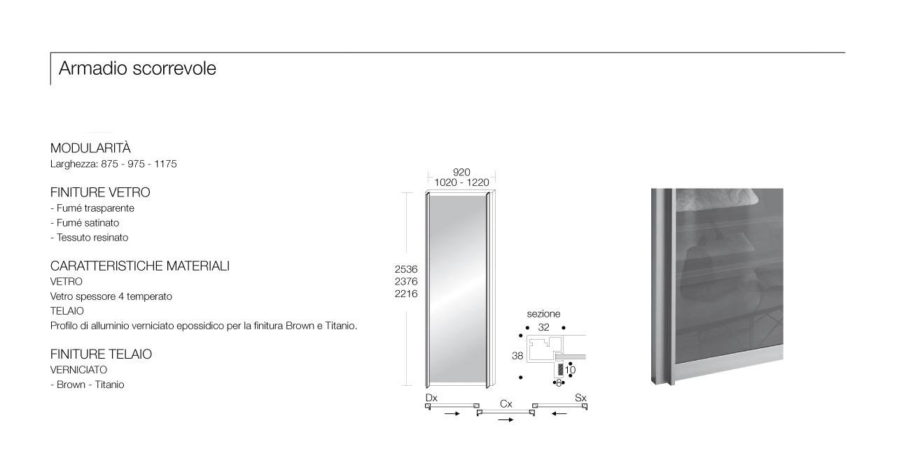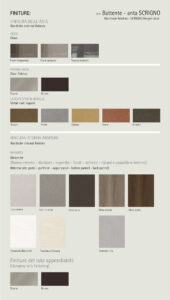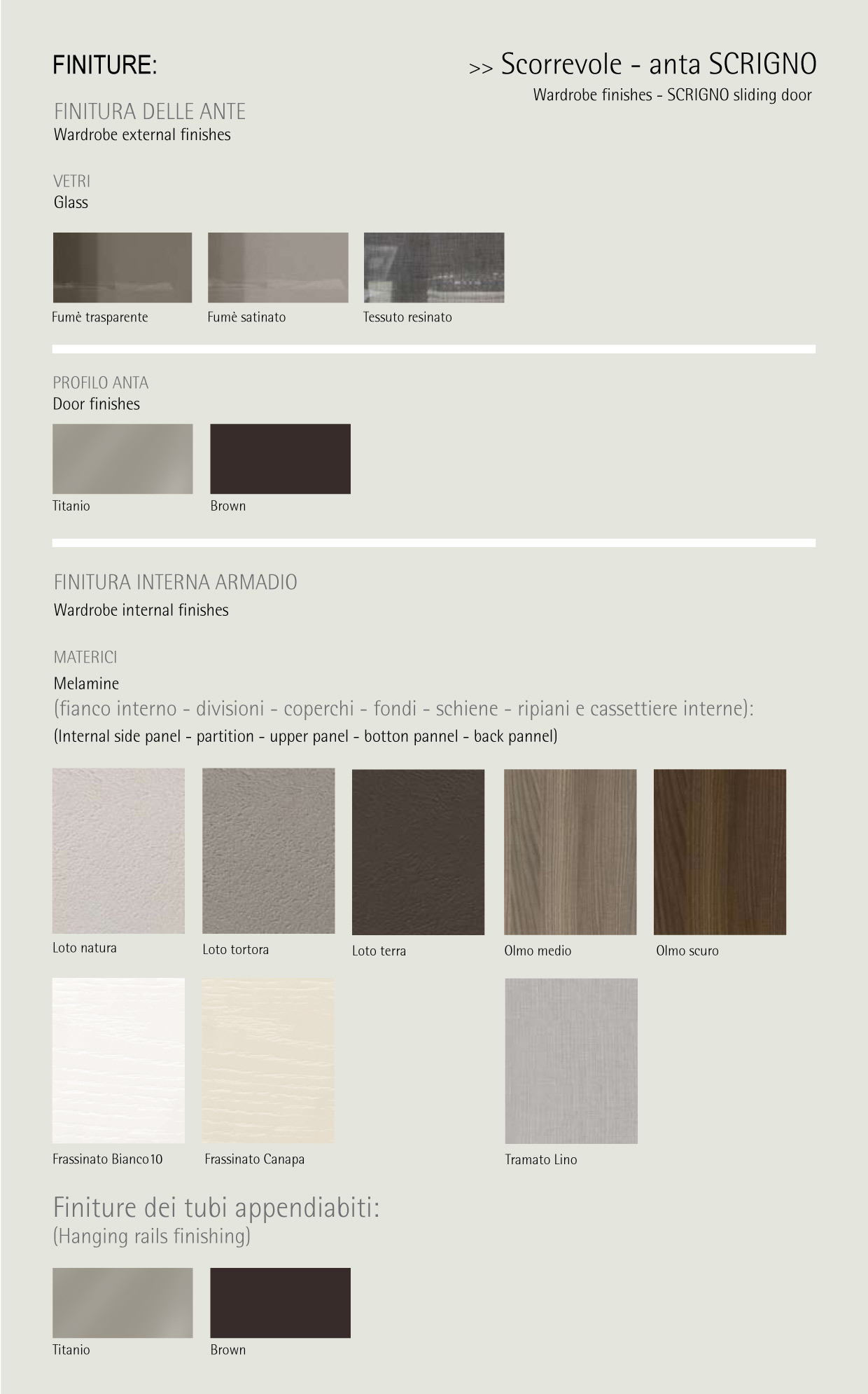 Scopri i materiali e i colori degli interni, degli esterni e i particolari per questo modello della Linea Armadi Confalone.