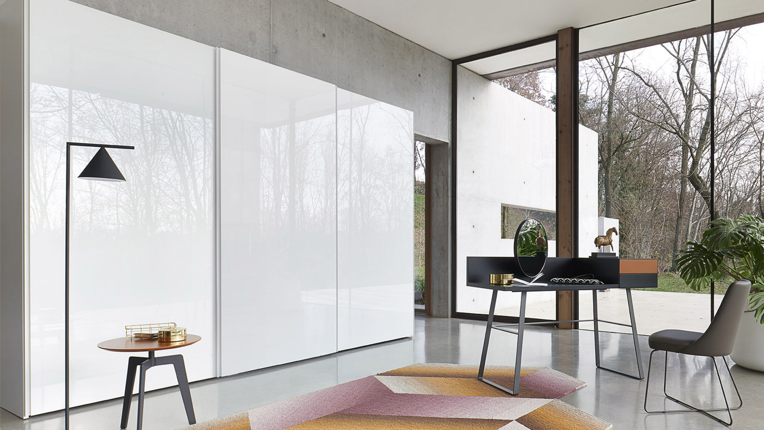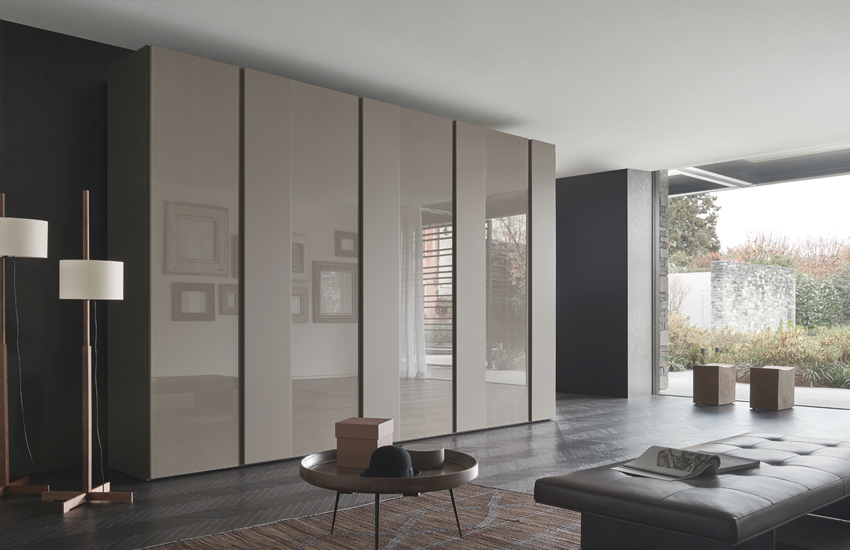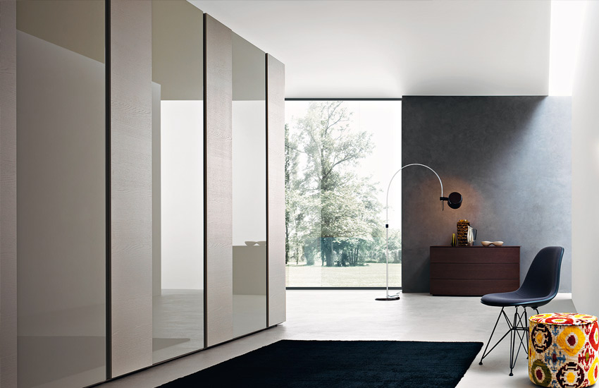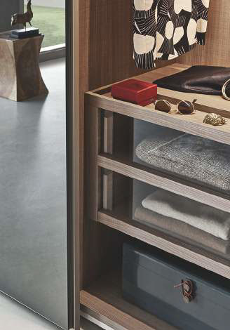 Giocare con le ante e con i colori per creare effetti di luci ed ombre si arricchisce della possibilità di alternare ante dallo spessore di 35 mm e 25 mm. Per completare la possibilità di alternare i volumi al sistema di anta scorrevole può essere abbinato un modulo o più moduli con ante a battenti. A completare un modello di armadio dalle prerogative straordinarie, l’allestimento degli interni. Un mondo di idee per rendere funzionale la disposizione dei capi: dal ripiano luminoso in vetro, allo svuotatasche collocato frontalmente sul ripiano, al cassetto con separatori interni.