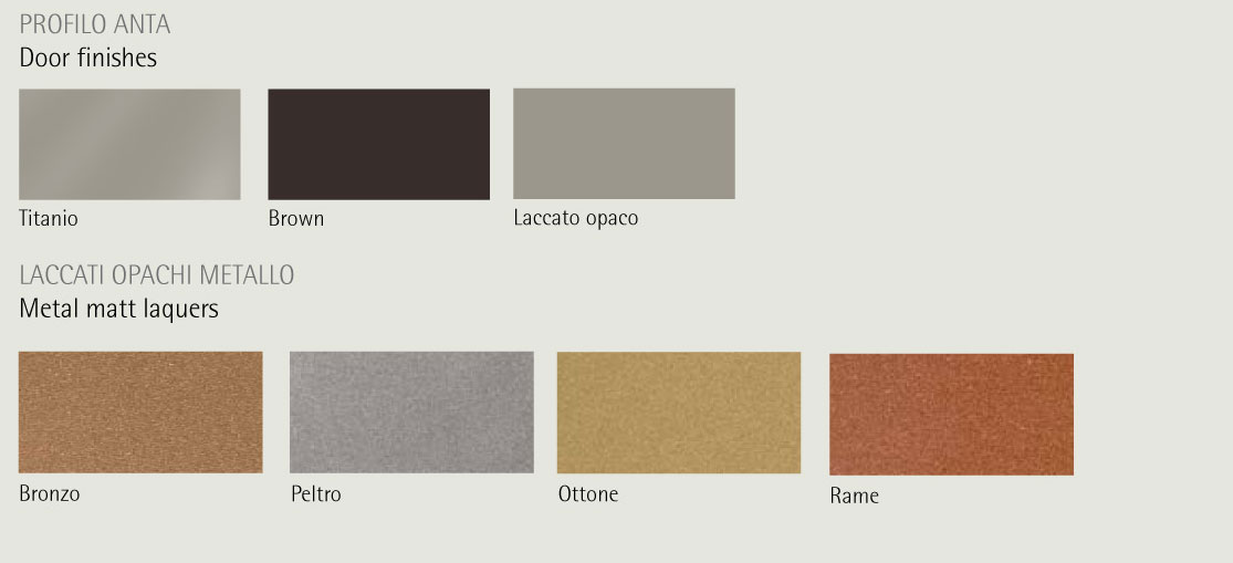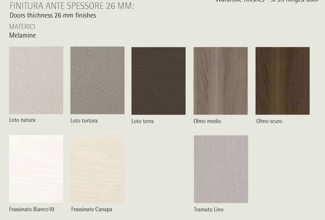 Scopri i materiali e i colori degli interni, degli esterni e i particolari per questo modello della Linea Armadi Confalone.
