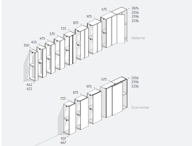 Questo modello di armadio Confalone può essere realizzato con anta a battente, scorrevole e con moduli che alternano le due tipologie di anta. Uno dei tratti distintivi di questo modello è la possibilità di scegliere e alternare anche lo spessore delle ante, per creare un gioco di dinamico delle forme.