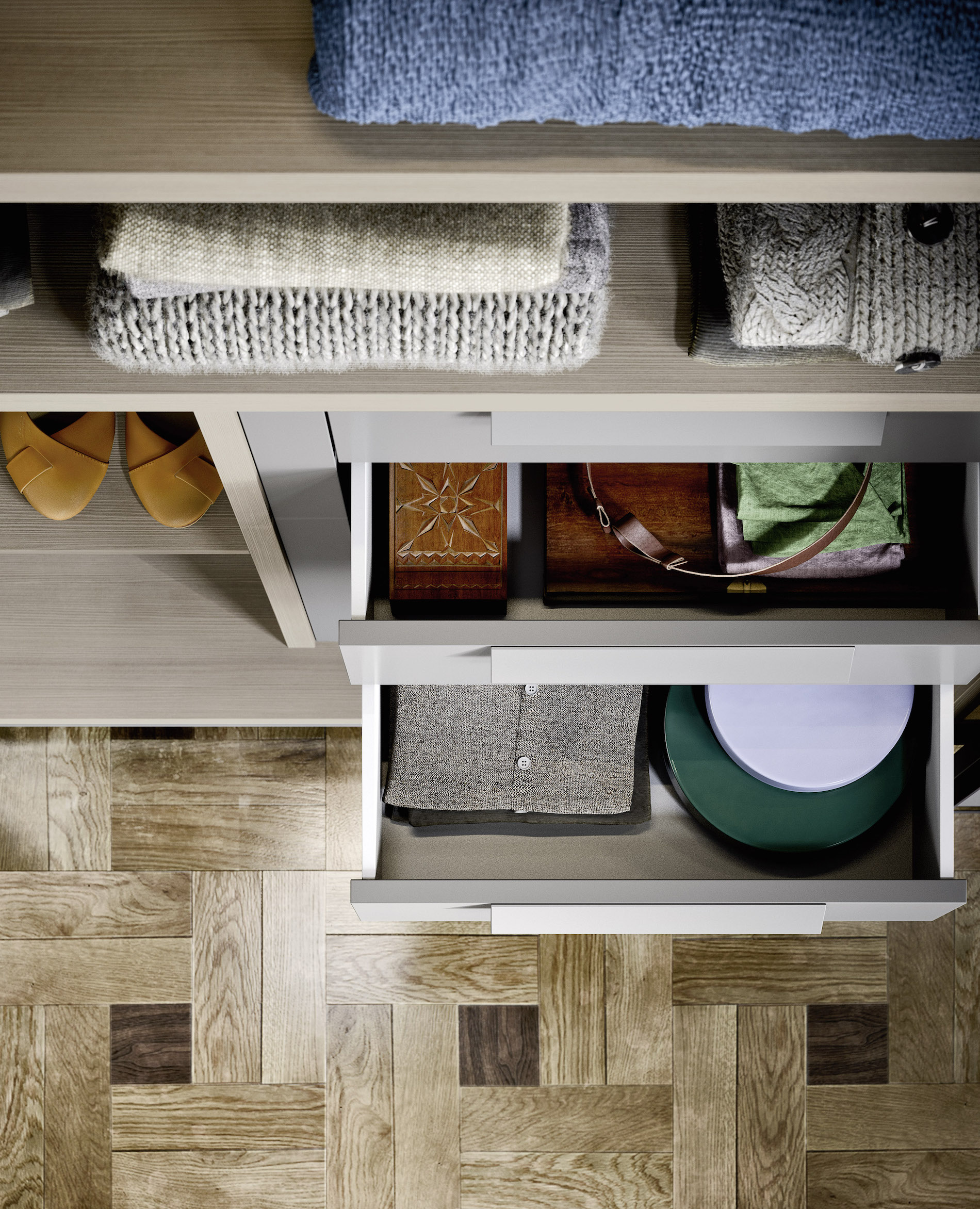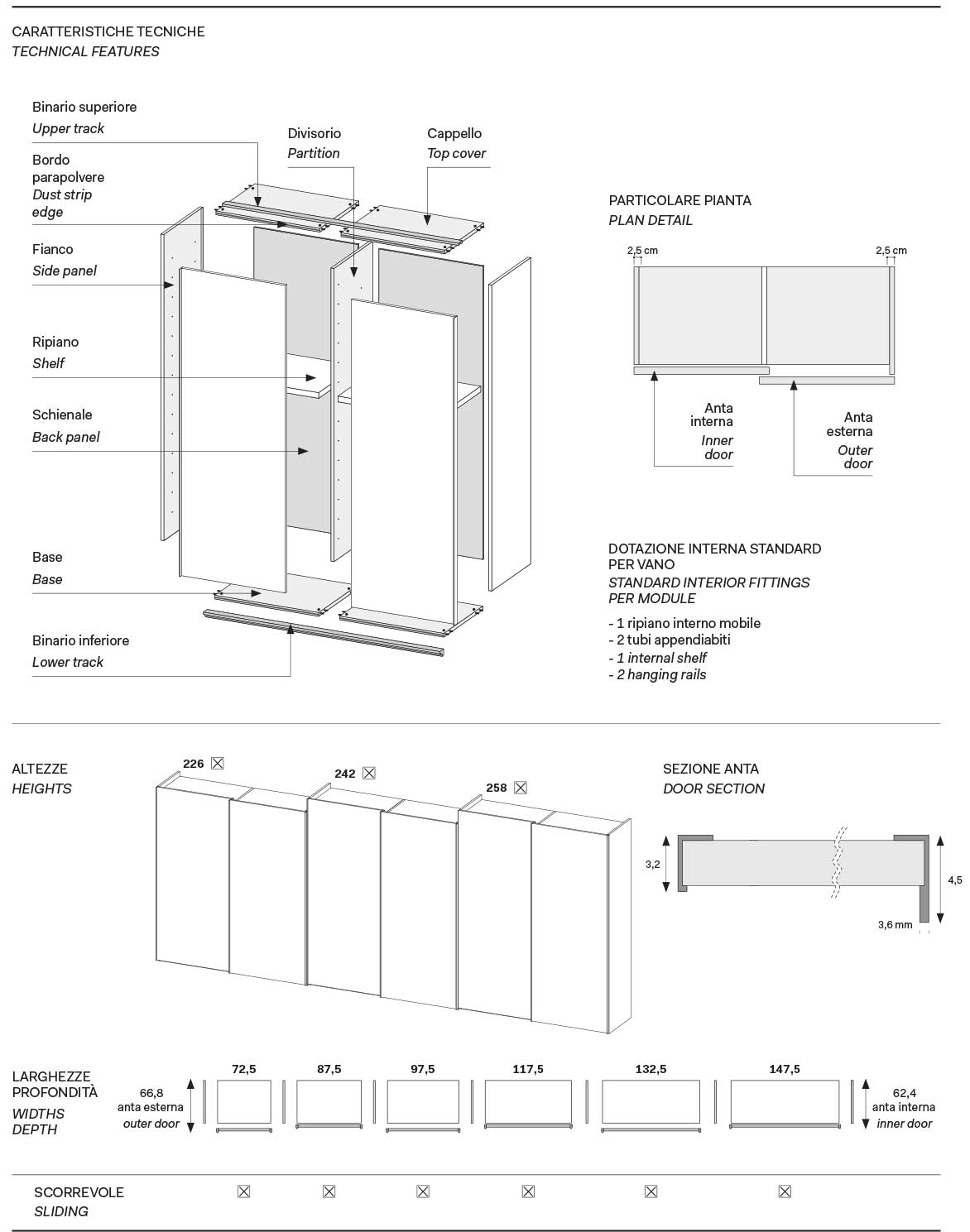 Scopri i materiali e i colori degli interni, degli esterni e i particolari per questo modello della Linea Armadi Confalone.
