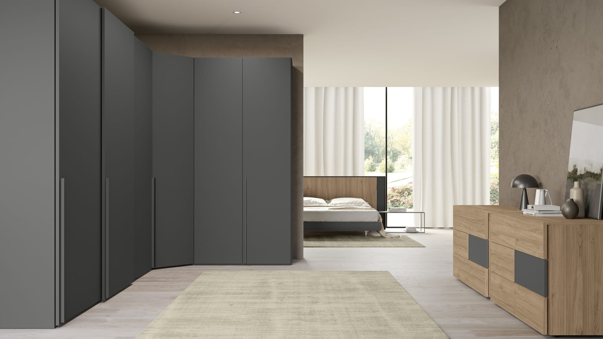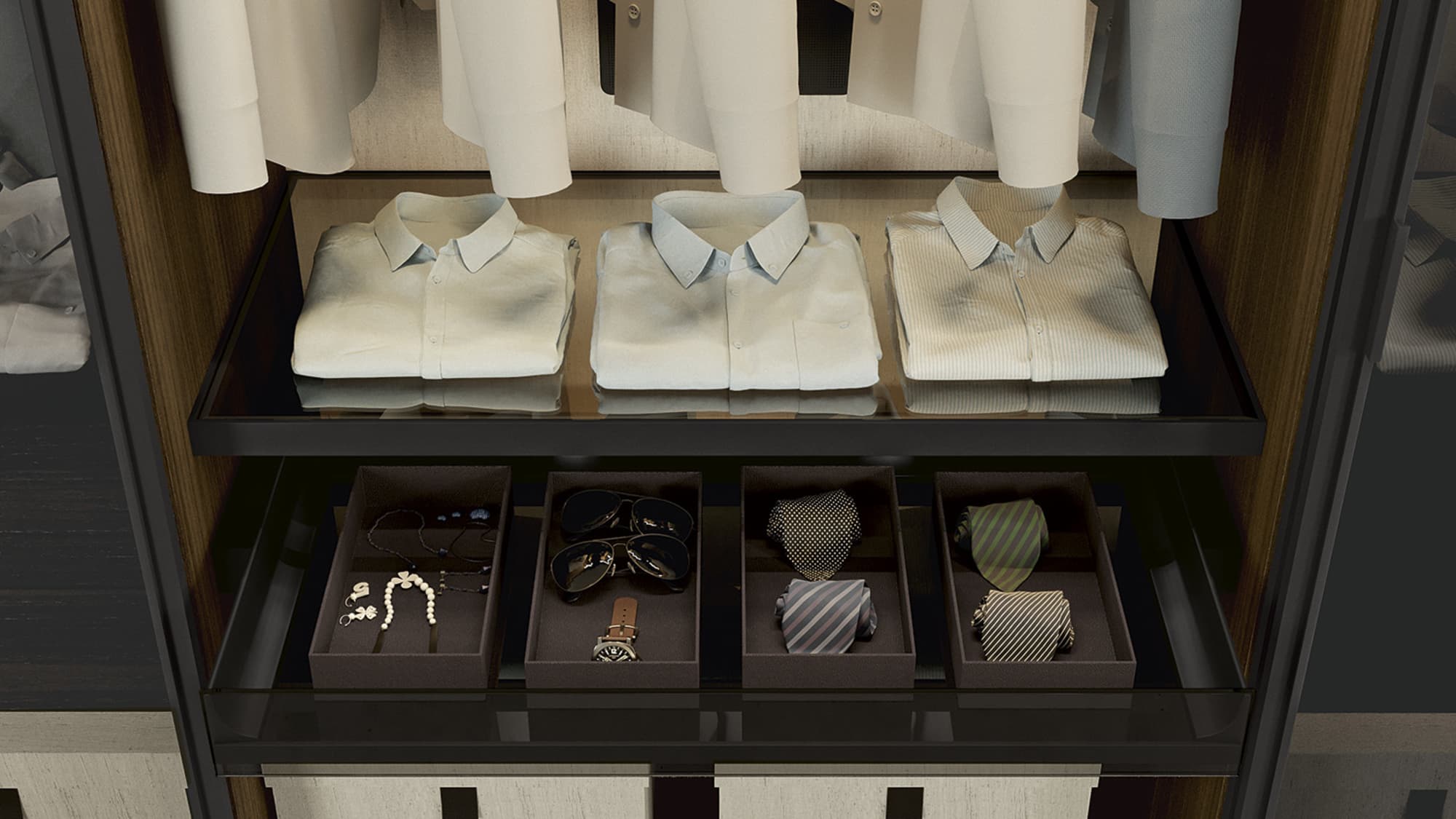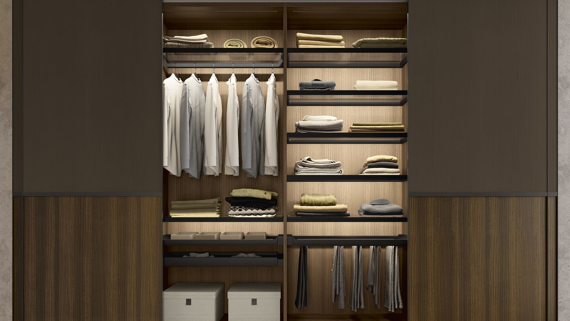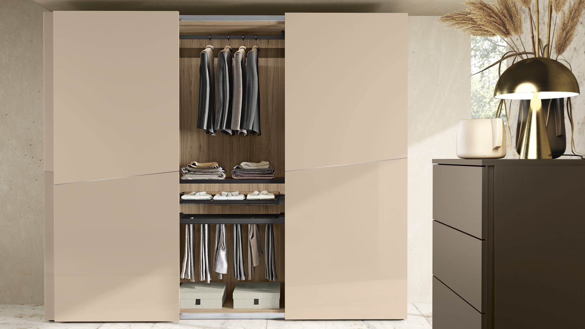 Una vasta gamma di soluzioni e complementi per ottimizzare gli spazi interni di un armadio dal design accattivante e funzionale per le quattro stagioni.