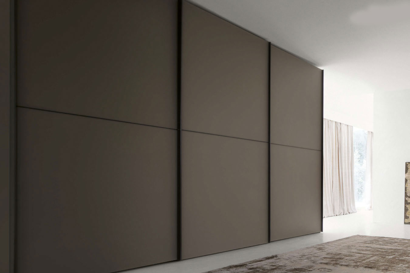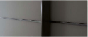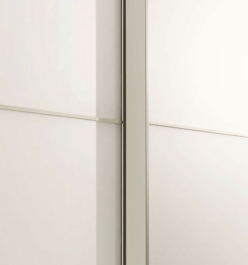 Questo modello di Armadio Confalone è caratterizzato da grandi ante scorrevoli in vetro abbinate a un profilo in metallo. L’effetto materico viene accentuato dai colori pieni interrotti soltanto dalle linee geometriche tracciate dal telaio in metallo.