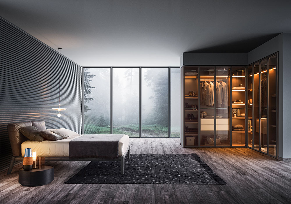 Questa linea di armadi Confalone gioca con il contrasto della cornice offrendo alla vista la disposizione dei capi interni e il contrasto degli elementi interni che possono essere personalizzati con una palette di colori e materiali ricchissima. Dalle variazioni cromatiche ai materiali che comprendono ripiani in vetro o foderati in pelle sintetica, è disponibile una serie di optional interni davvero vasta.