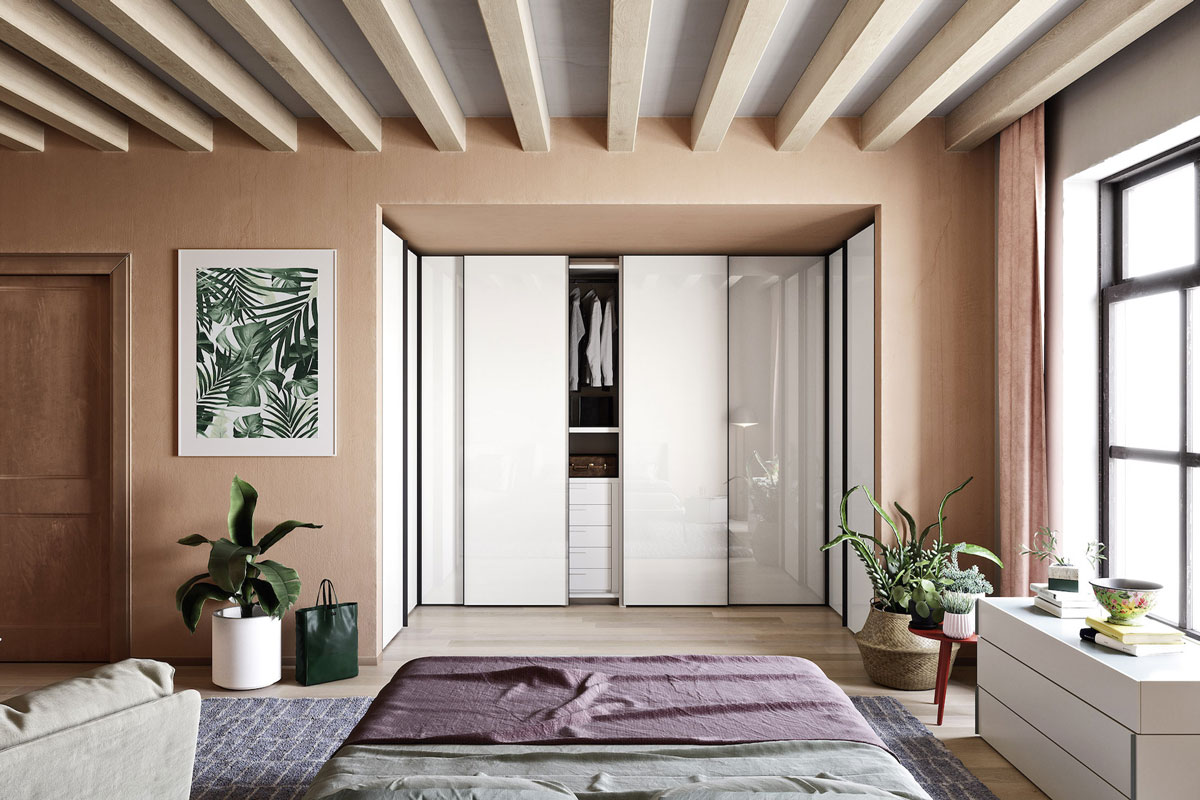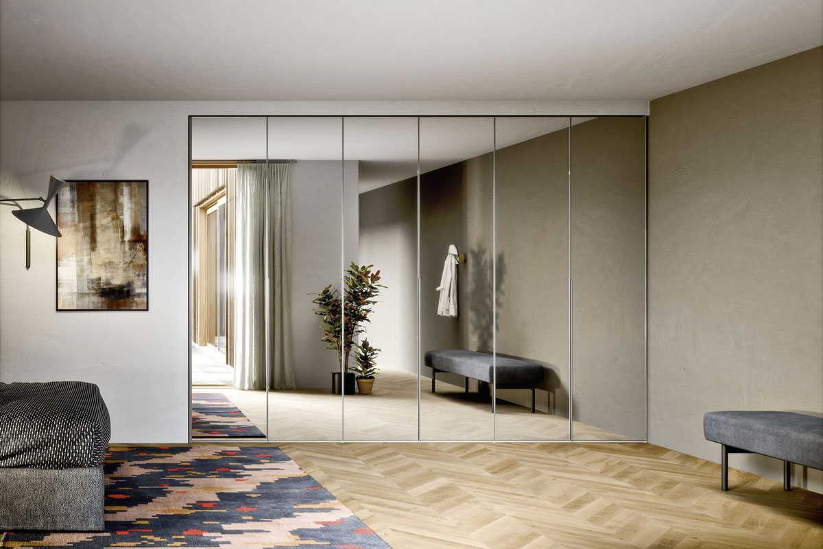 Armadio anta a battente o scorrevole caratterizzato dalla leggerezza dei cristalli e degli specchi che ne caratterizzano i pannelli. Disponibile nelle configurazioni a muro, a incasso e angolari, questo modello di armadio Confalone mostra un profilo in acciaio, brunito o spazzolato e in tutti i colori laccati opachi. Ampiezza e grande profondità caratterizzano la versione scorrevole.