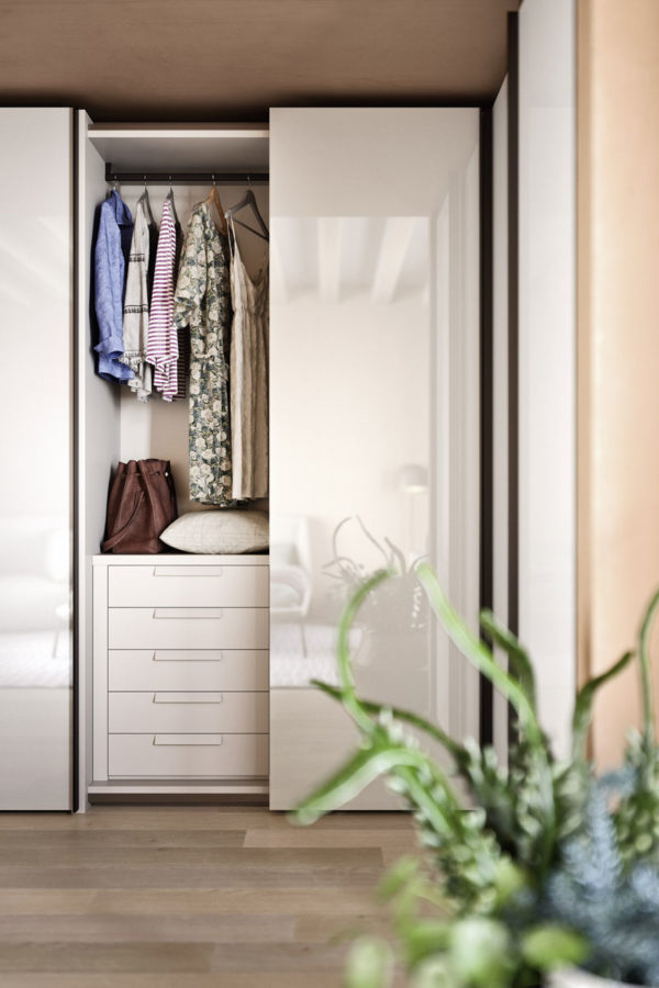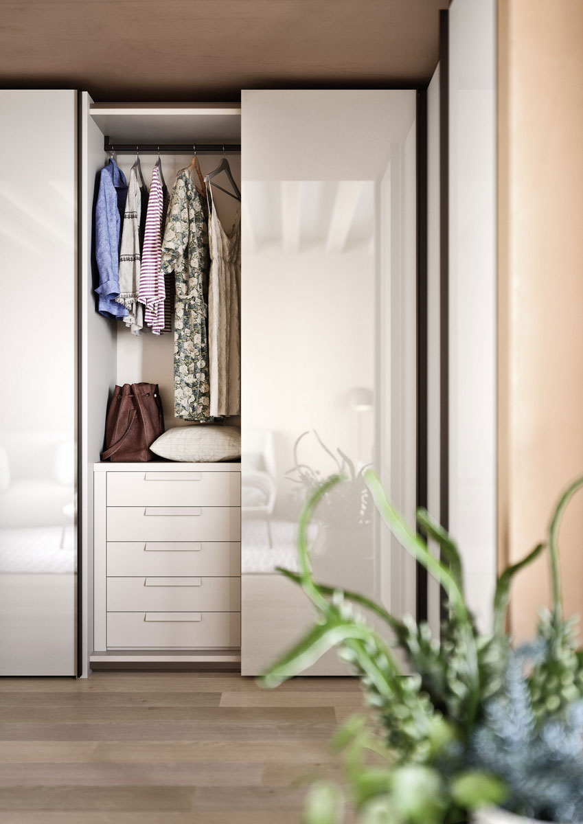 Scopri i materiali e i colori degli interni, degli esterni e i particolari per questo modello della Linea Armadi Confalone.
