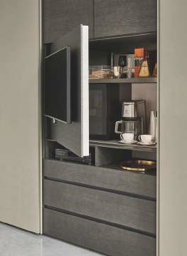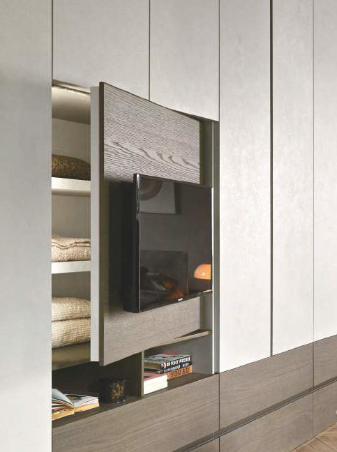 L’armadio Confalone con una soluzione porta Tv a vista o a scomparsa per chi vuole una camera da letto in ordine e senza rinunciare alla tecnologia. Il modulo porta tv è orientabile ed integrato nelle ante dell’armadio.