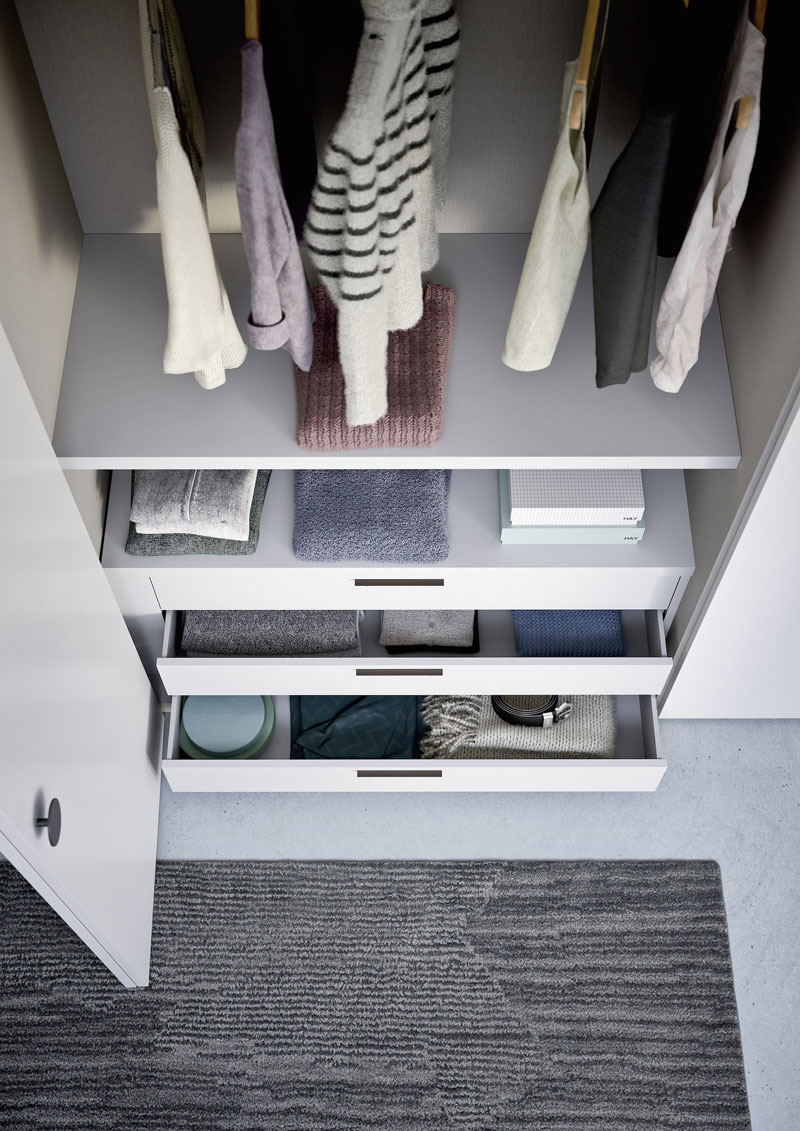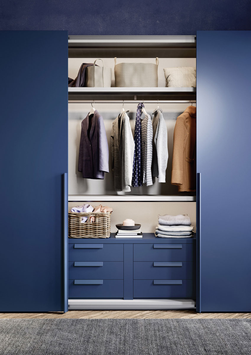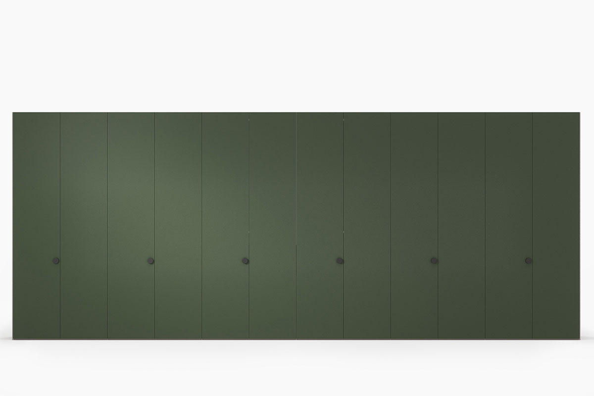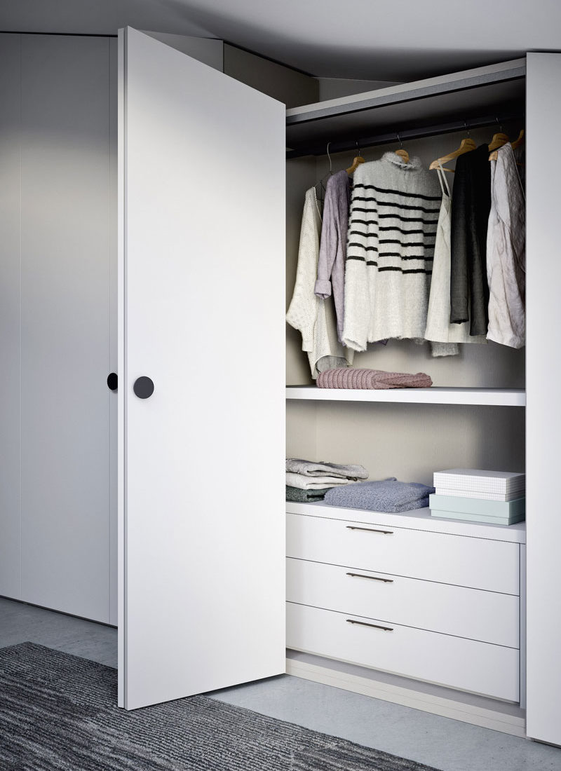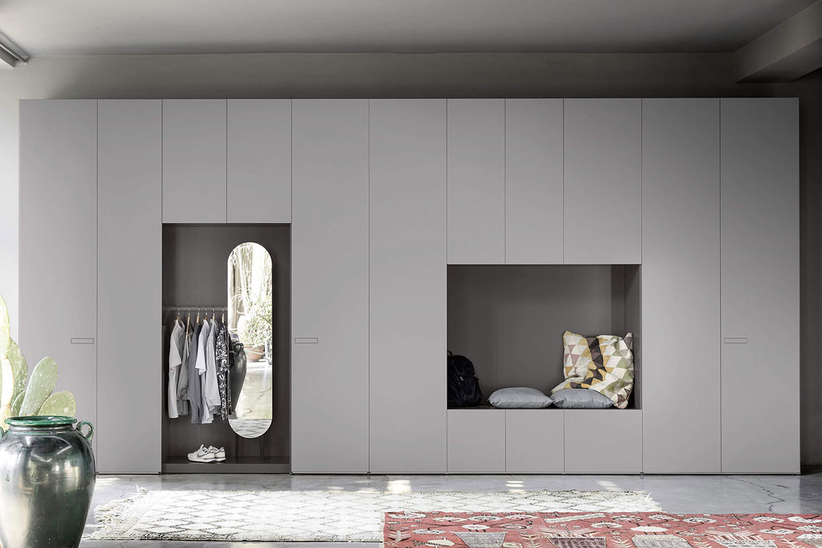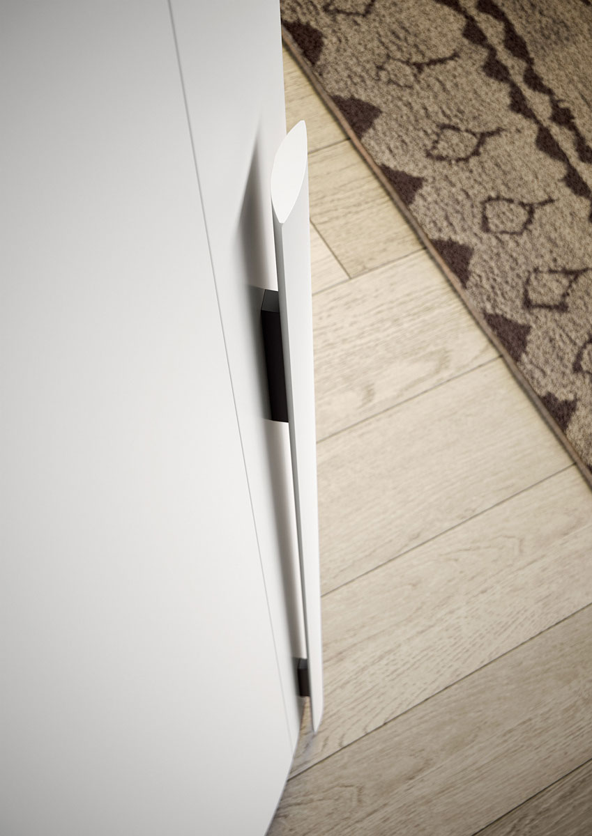 L’armadio con anta scorrevole è disponibile in tutte le tonalità laccate opache, nelle finiture nobilitato, ecolegno e super-matt e può essere abbinato a diverse maniglie. L’armadio può essere a incasso, a muro o angolare.