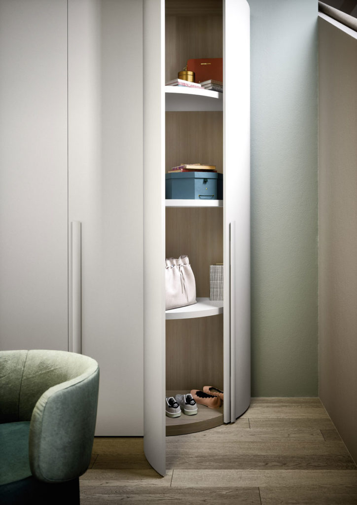L’armadio Curvo con ante a battente creerà dei fantastici giochi di spazi. Un elemento da mostrare piuttosto che celare. I finali con anta curva dalla fine lavorazione catturano sguardo. Le ante possono essere abbinate a maniglie in marmo di carrara, in legno e in metallo.