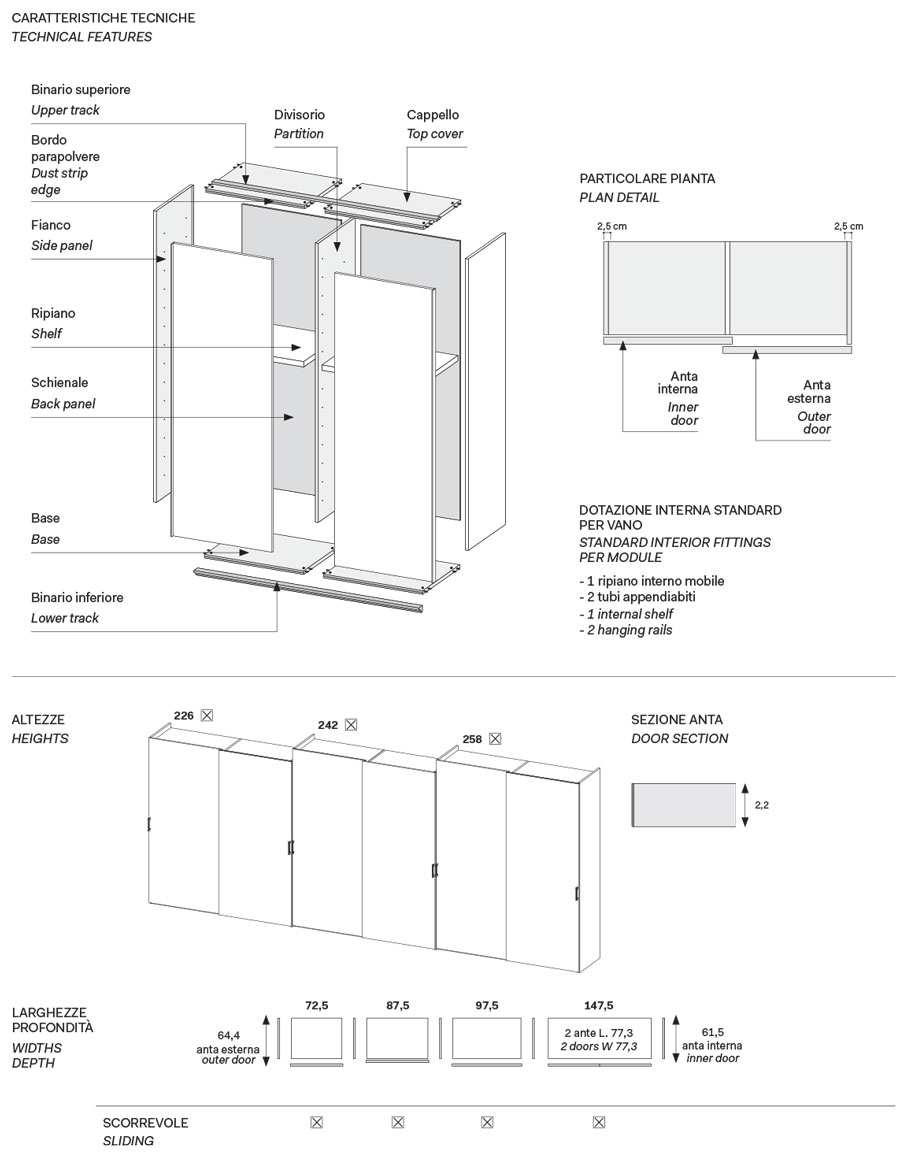 Scopri i materiali e i colori degli interni, degli esterni e i particolari per questo modello della Linea Armadi Confalone.