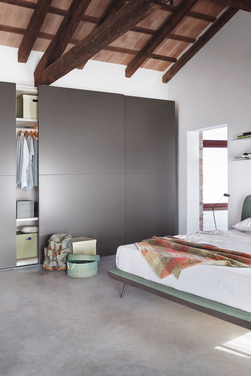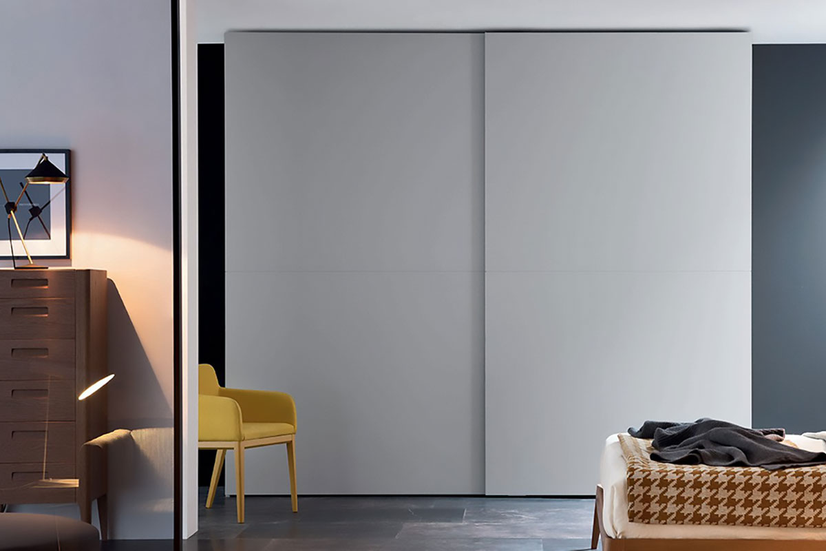 Armadio con anta scorrevole adatto a tutti i tipi di spazio e parete. Questo armadio Confalone può essere realizzato ad incasso, a muro o angolare. Il design sobrio e minimale riceve un elemento di contrasto che cattura lo sguardo. Le ante di questo modello sono solcate da un sottile profilo verticale.