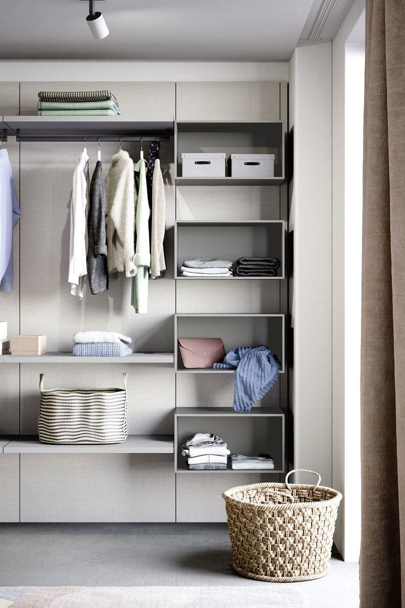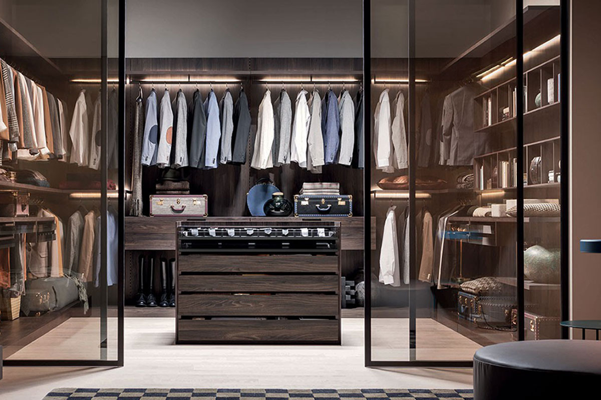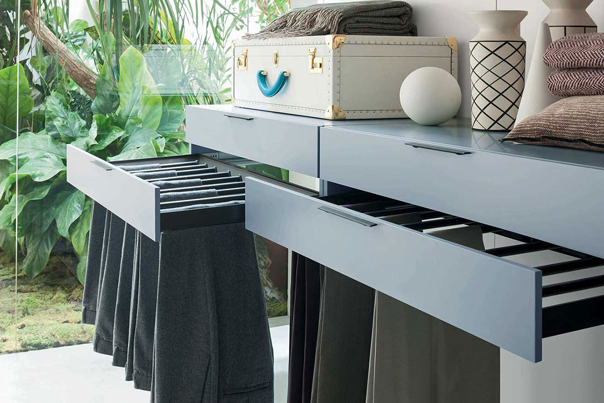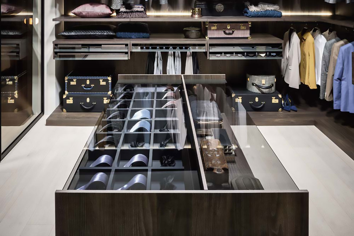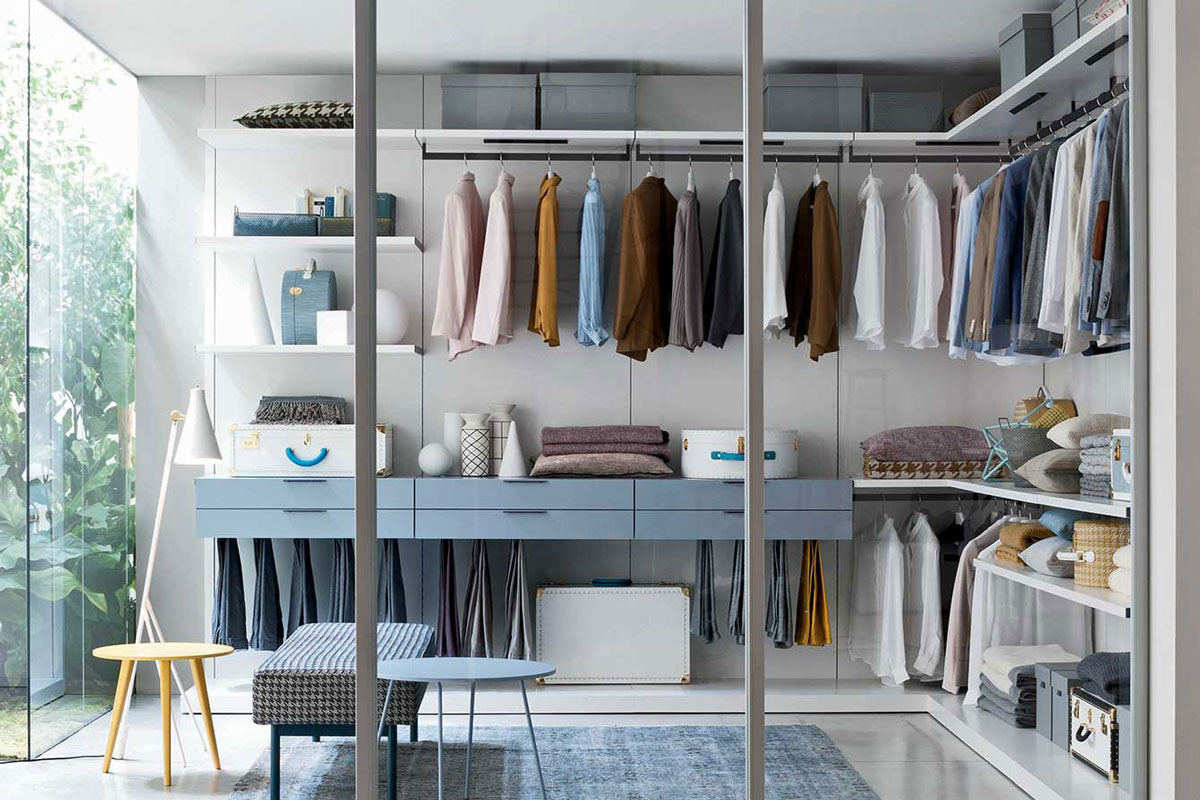 Le cabine armadio Confalone possono essere allestite con cassettiere, ripiani flat o fold, moduli angolari, consolle centrali, ripiani portascarpe, tubo appendiabiti, vani a giorno e con ante.