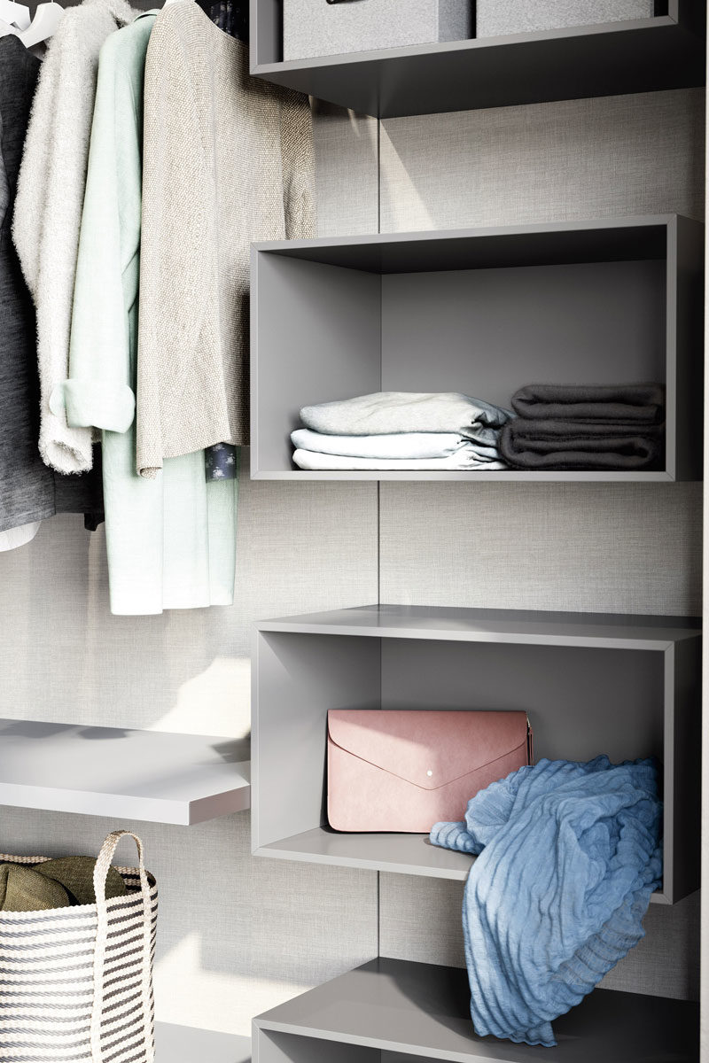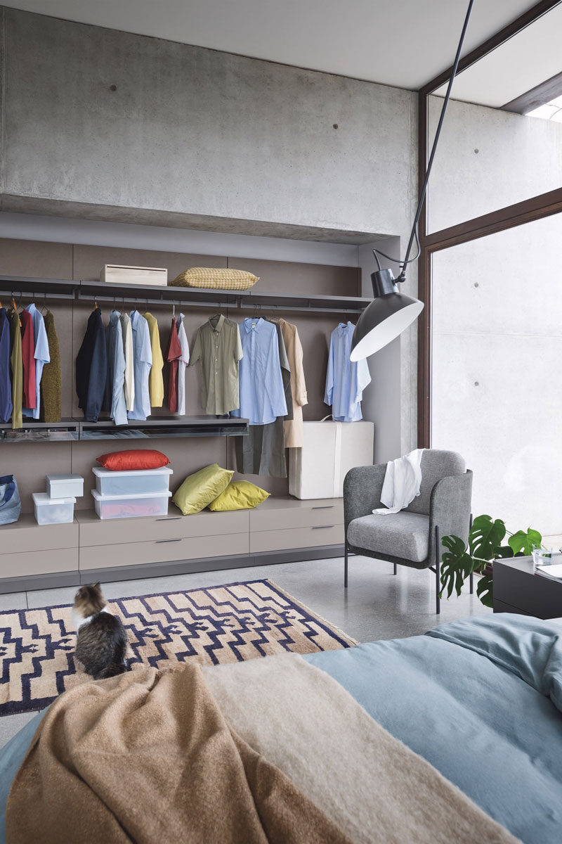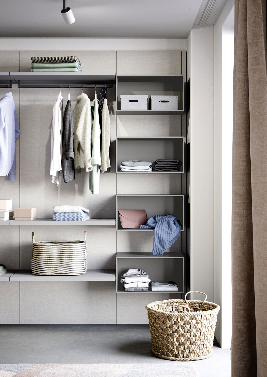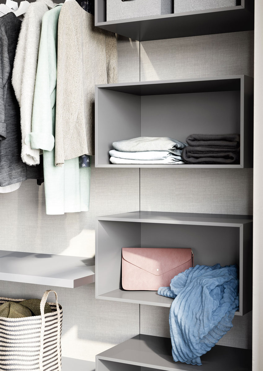 Le cabine armadio Confalone possono essere allestite con cassettiere, ripiani flat o fold, moduli angolari, consolle centrali, ripiani portascarpe, tubo appendiabiti, vani a giorno e con ante.