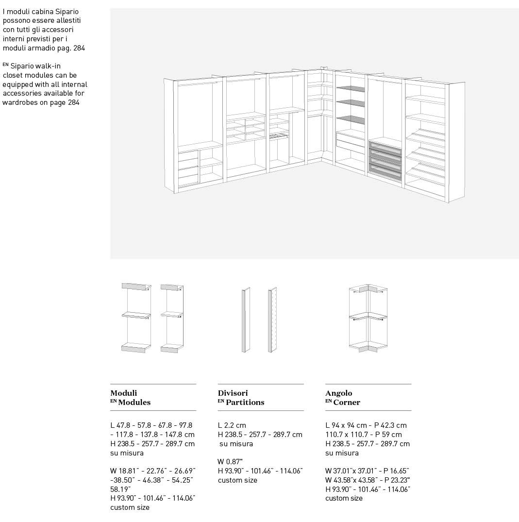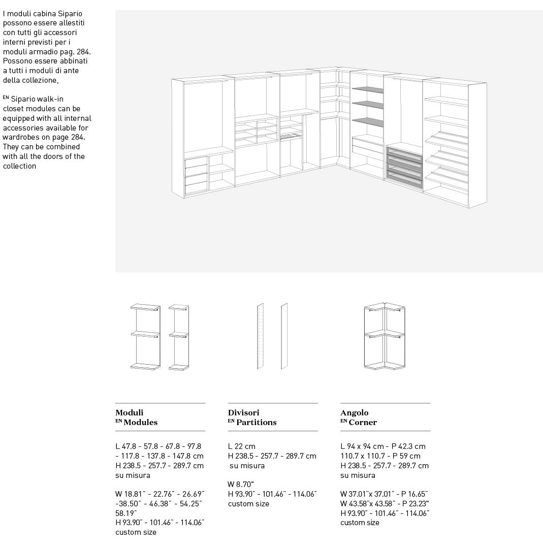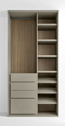 Scopri i materiali e i colori degli interni, degli esterni e i particolari per questo modello della Linea Armadi Confalone.