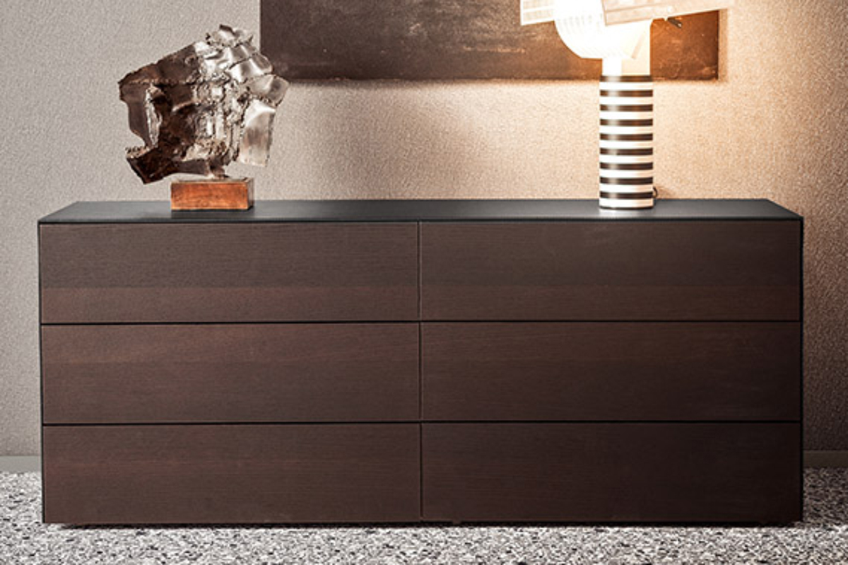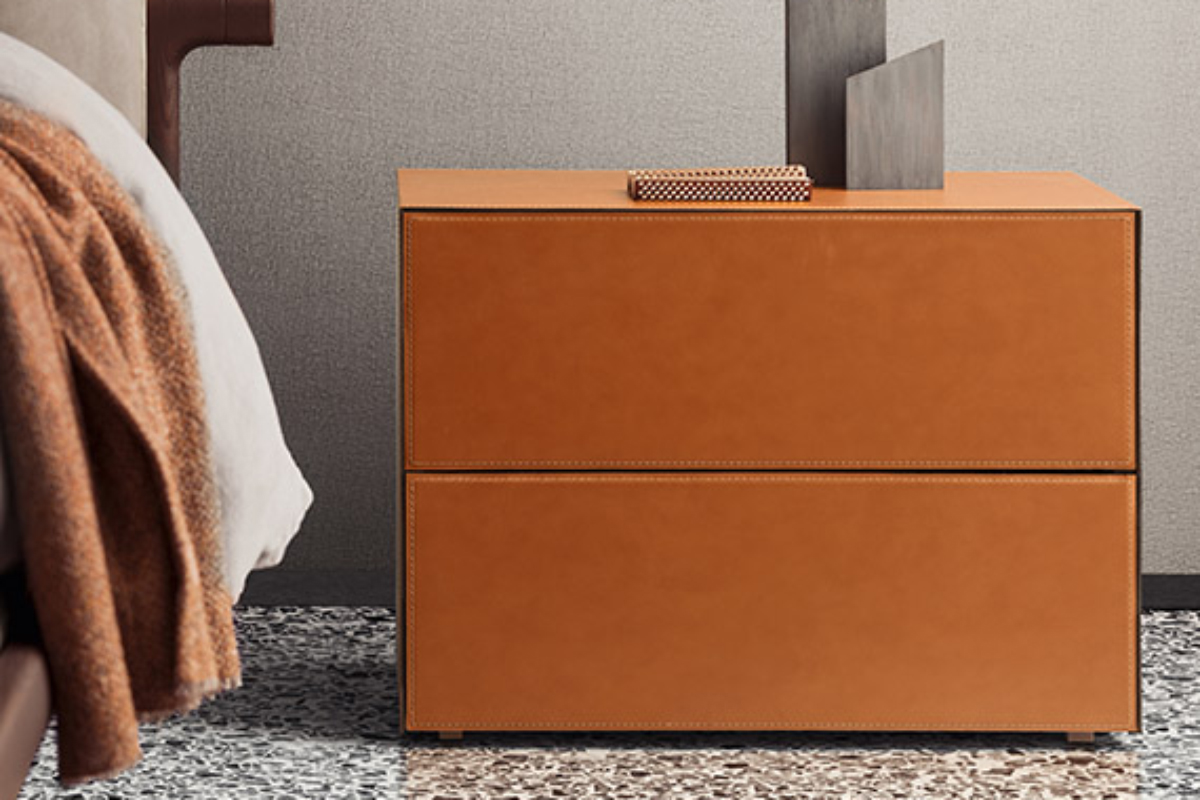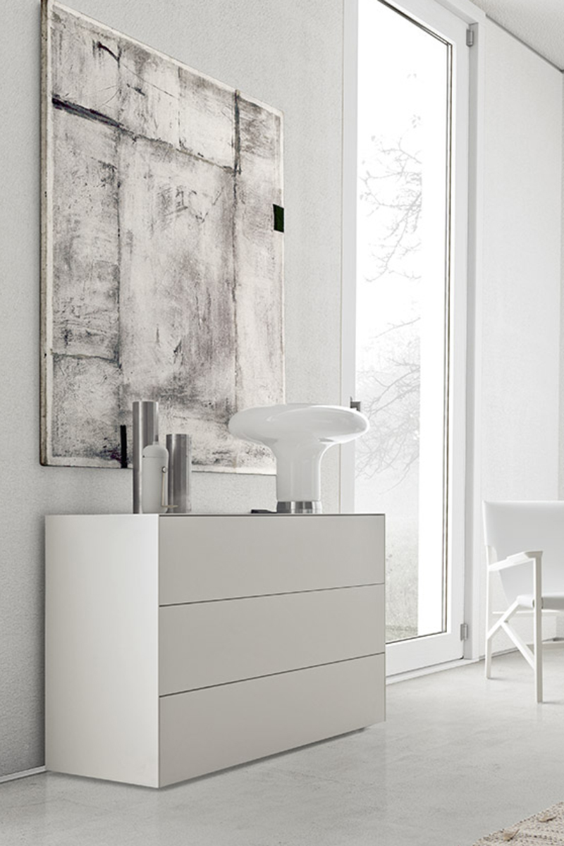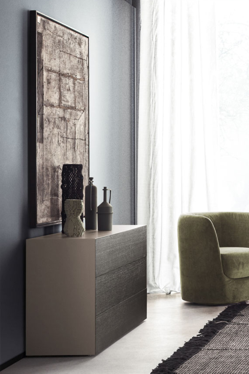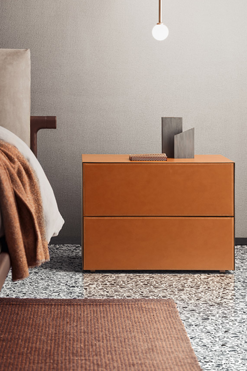 Questa linea notte di comodini e comò si distingue per il design dai corpi solidi senza soluzione di continuità, per le aperture dei cassetti a pressione e la vasta scelta di materiali.