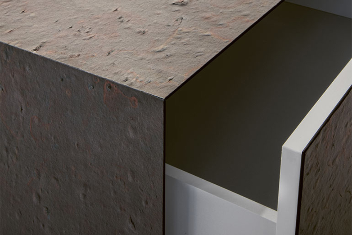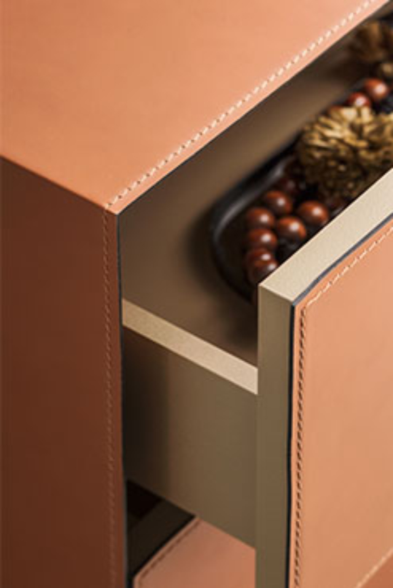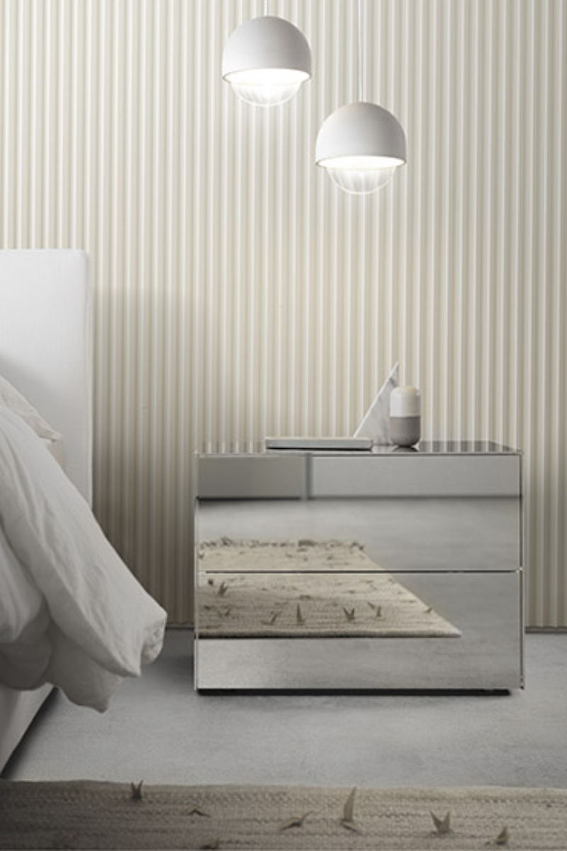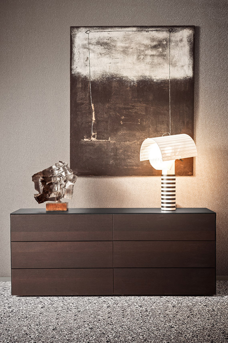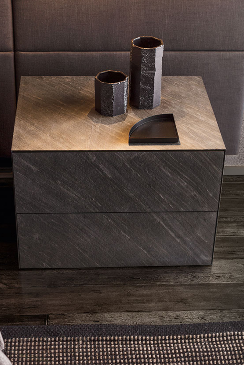 Questa linea notte di comodini e comò si distingue per il design dai corpi solidi senza soluzione di continuità, per le aperture dei cassetti a pressione e la vasta scelta di materiali.