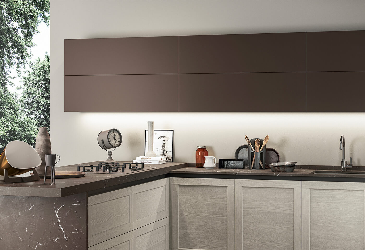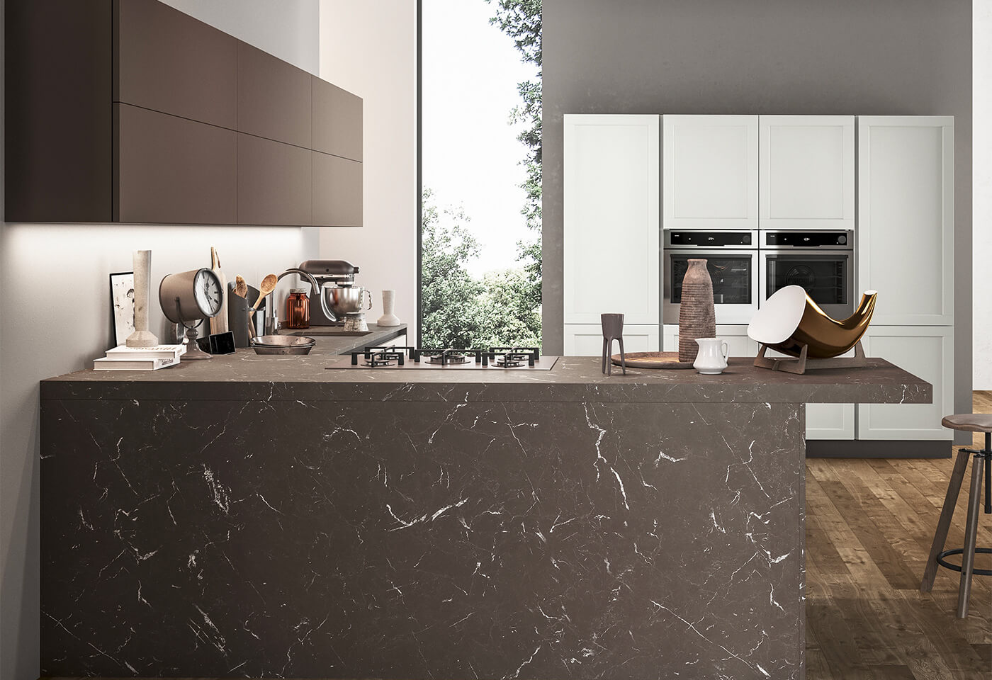L’alternanza tra pieni e vuoti, come l’accostamento di elementi dagli spessori differenti esaltano la vista e evidenziano i differenti spazi di lavoro. A completare l’accostamento di marmi preziosi utilizzati per il top su basi dai colori neutri, insistono i pensili dalle superfici laccate che chiudono le geometrie in continuità cromatica con zoccoli e gole dai colori scuri.