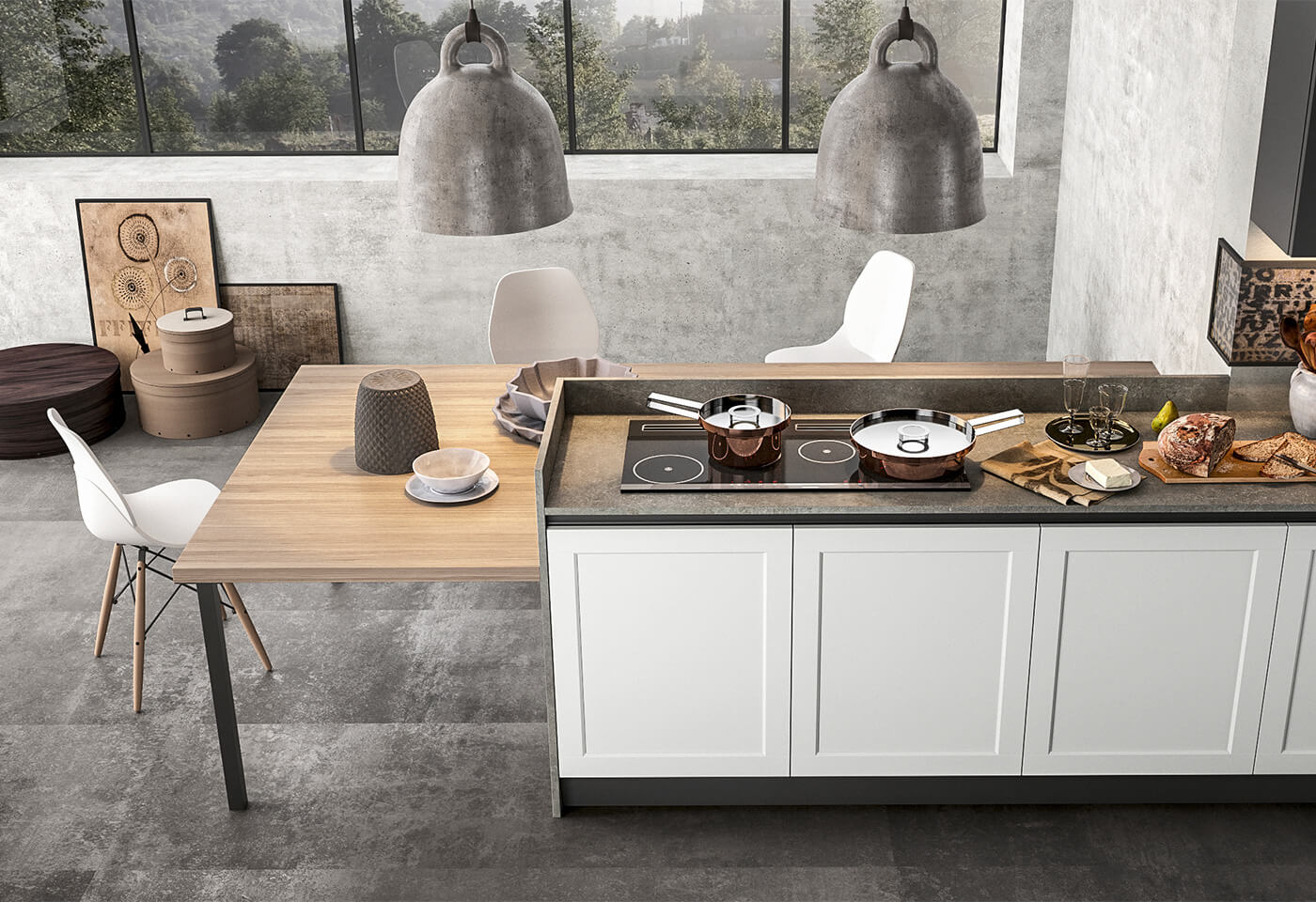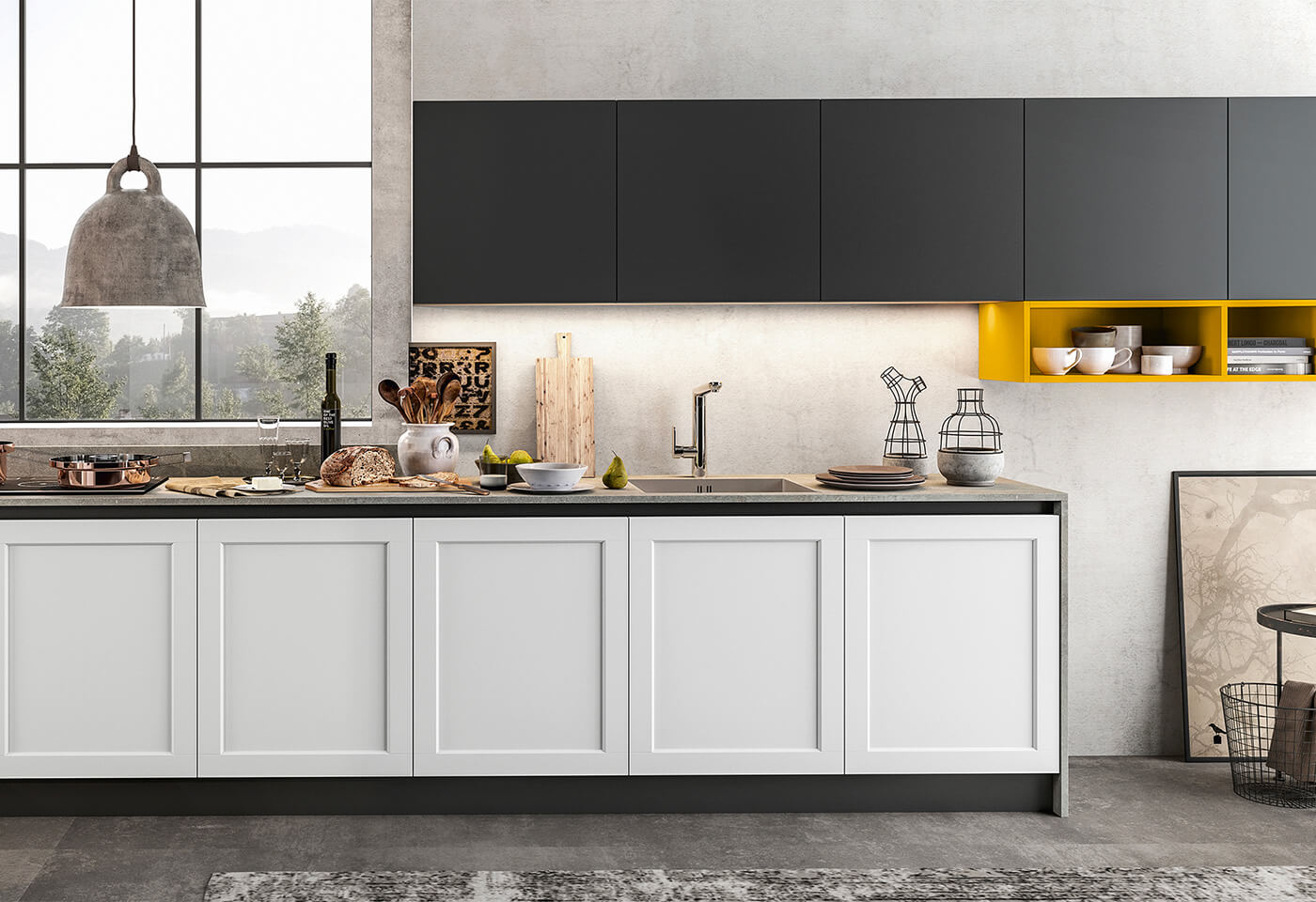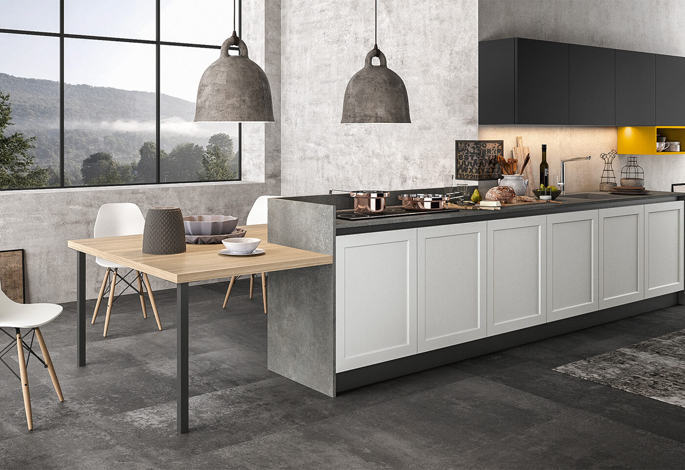 Questo modello di cucina by Confalone invita ad osare. Lo stile classico e delicato delle ante si sposa con elementi moderni. L’alternanza tra colori chiari e scuri trasforma uno stile lineare e pulito in un complesso geometrico che esalta e valorizza gli ambienti.