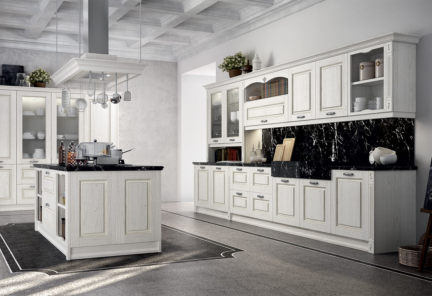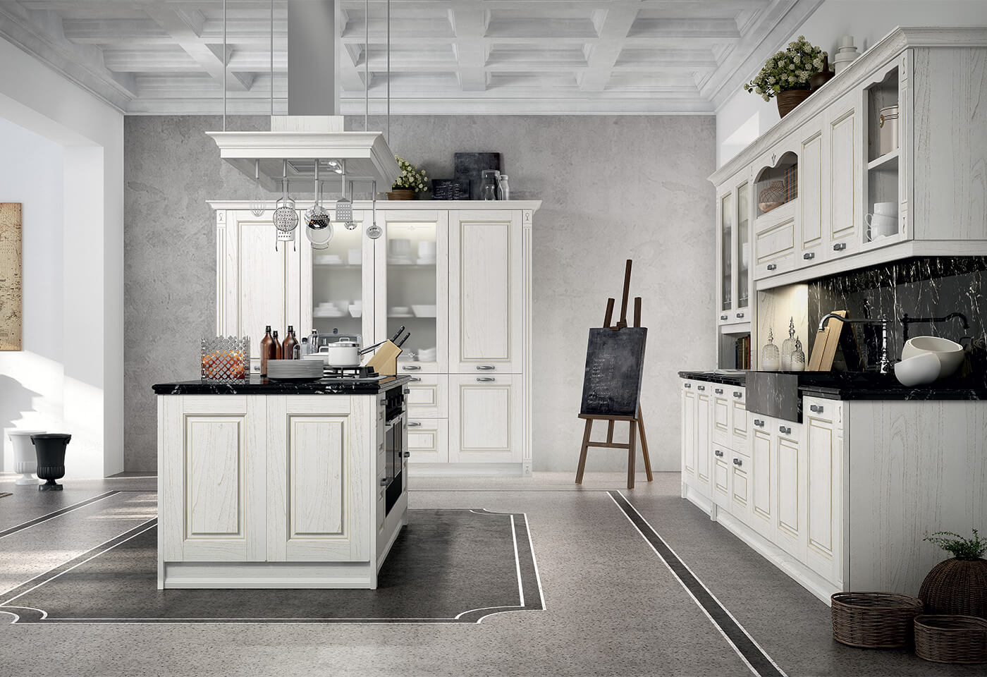 Le finiture decapate in abbinamento ai piani di lavoro in marmo si sposano con soluzioni di arredo moderno. La composizione ad isola rivela tutta la classe di una cucina dal design intramontabile. Pensili e vetrine a giorno completano lo stile di una cucina davvero chic.