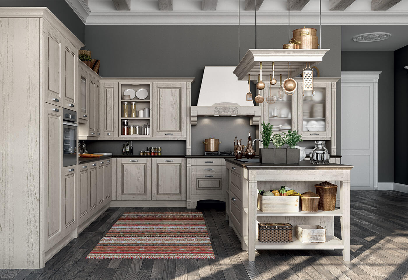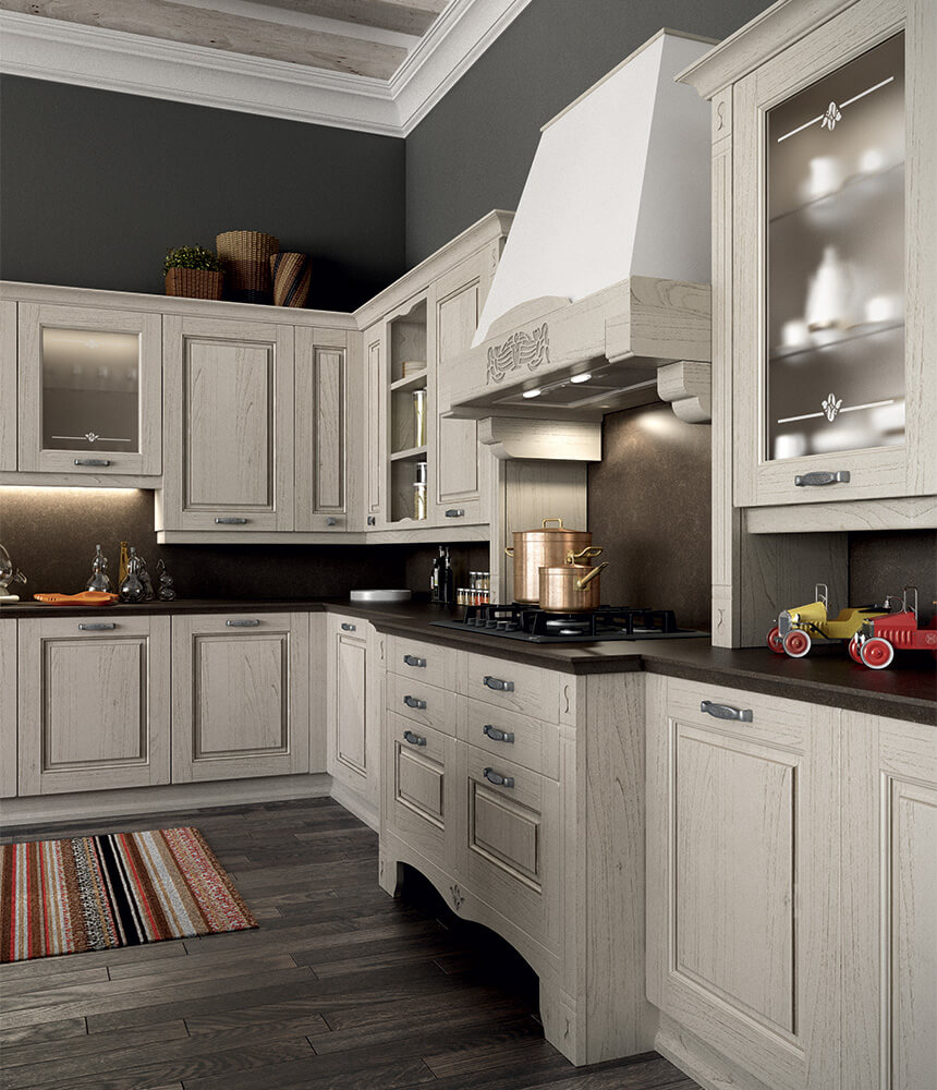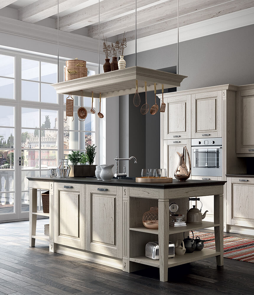 Legno massello, piani di lavoro a contrasto in materiali resistenti e di grande qualità. Il classico rivive in questo modello di cucina dallo stile fresco e leggero, dove i toni delle finiture sono un richiamo al calore della famiglia.