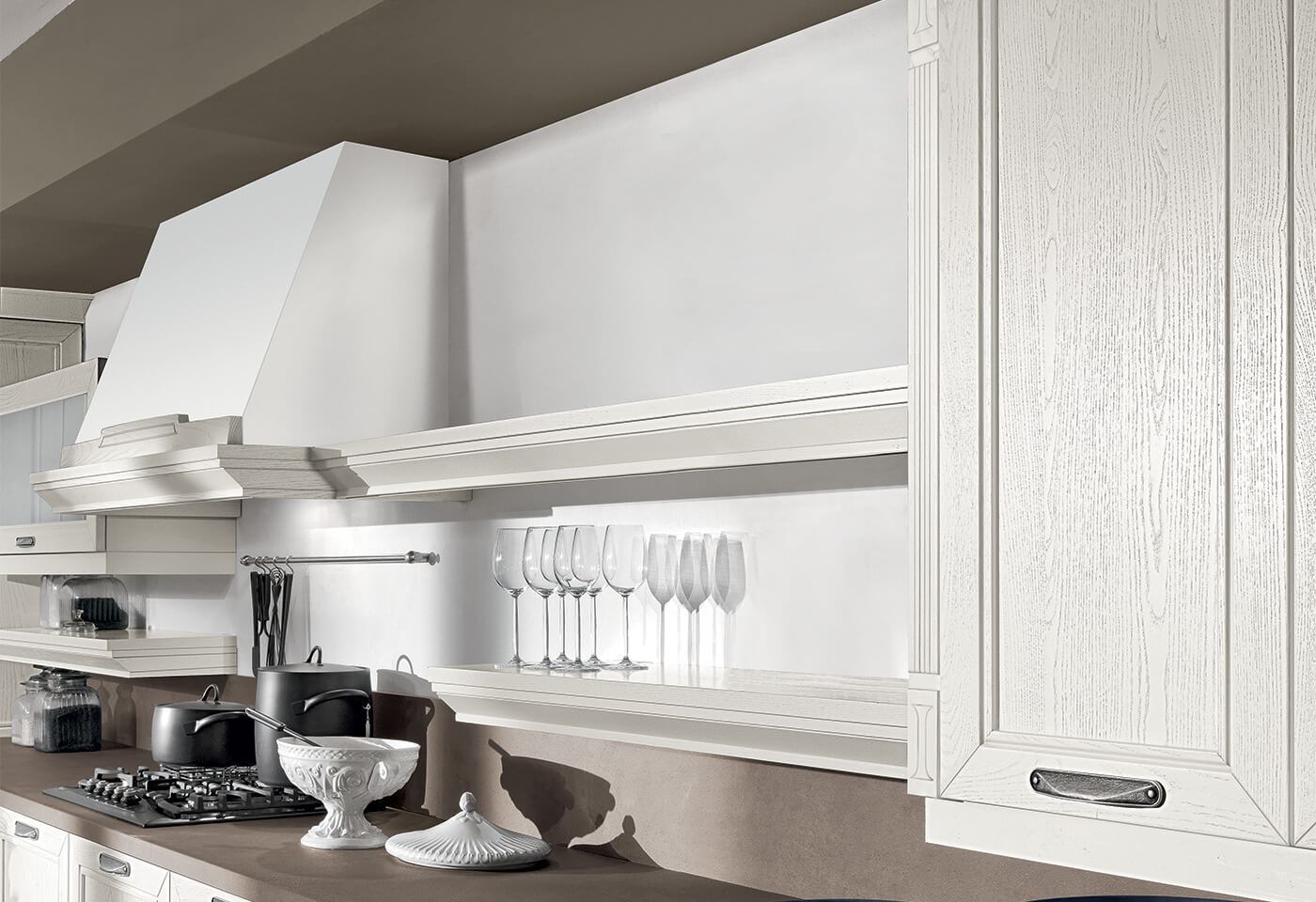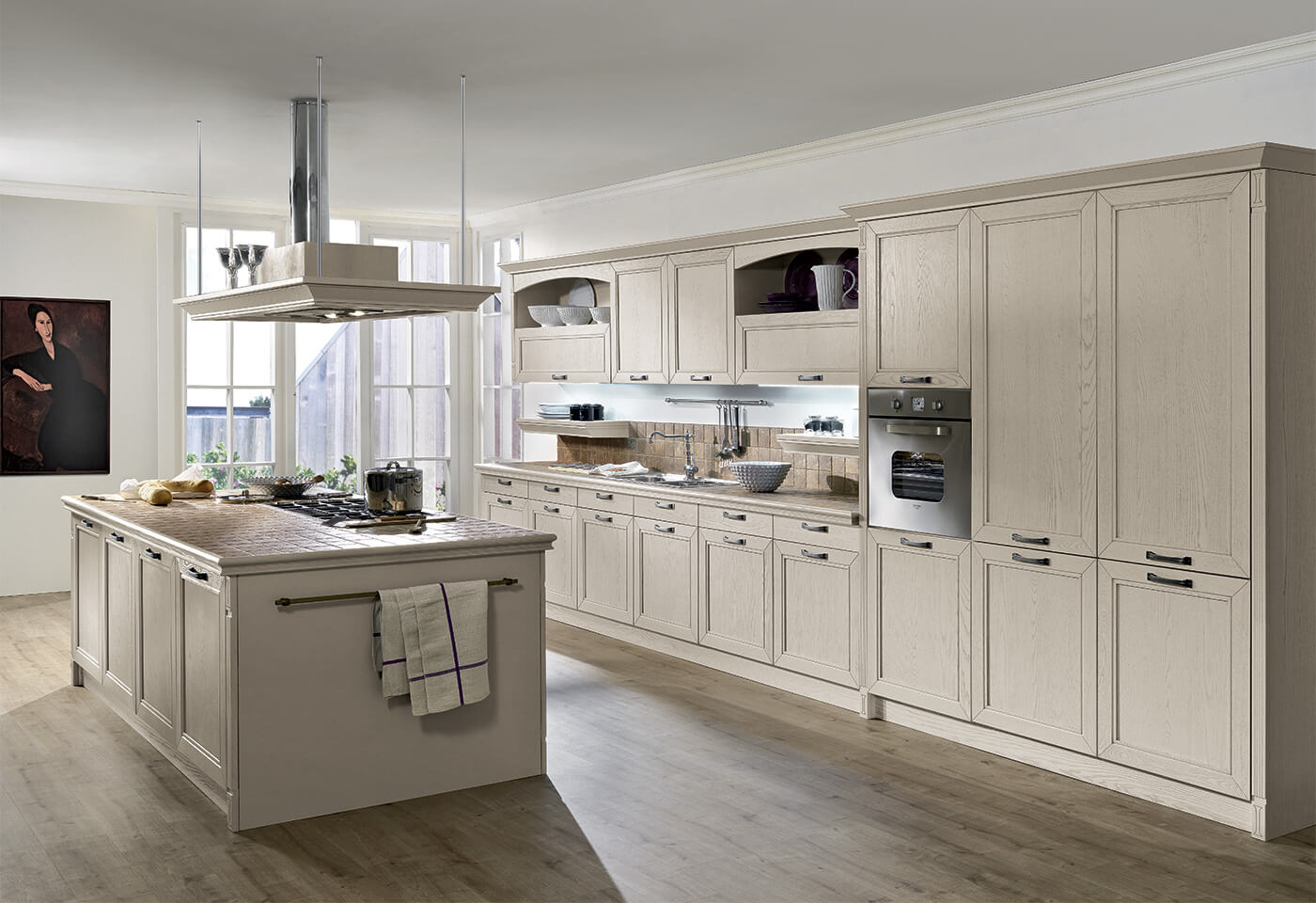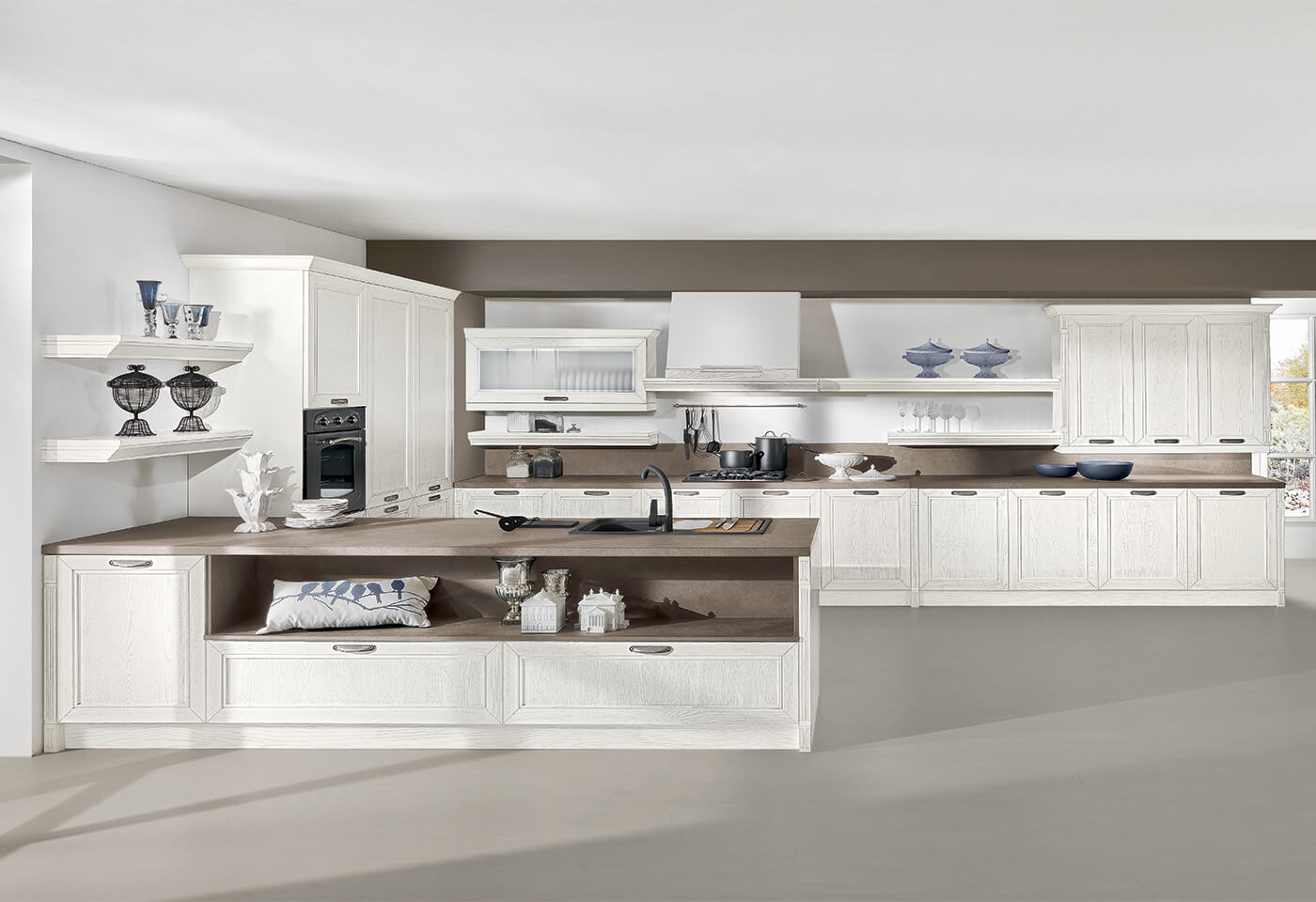 Una cucina tradizionale per eccellenza. Linee classiche e funzionalità al top. Il design abbina ad arte motivi decorativi e tratti razionali per un risultato sempre sobrio. Disponibile in versione lineare, angolare e con isola centrale, con anta laccata a telaio in frassino, nelle finiture laccato poro aperto e decapé nei colori bianco, Carrara, argilla, terra, titanio e in legno rovere anticato.