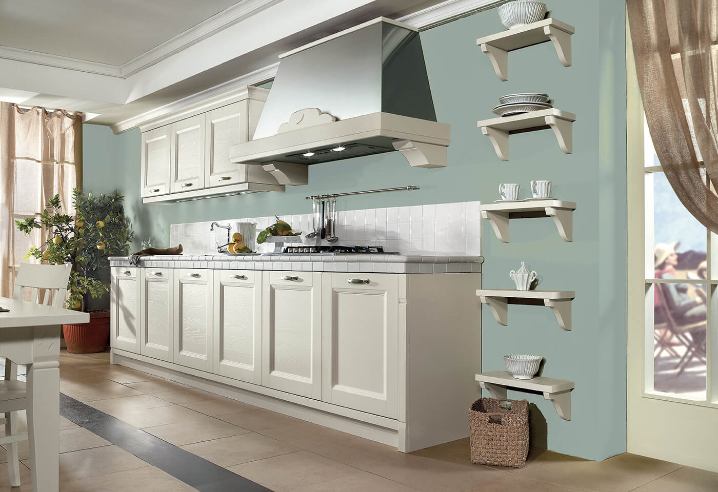 Questa cucina è un classico contemporaneo. Contraddistinta da un design pulito e da elementi e dettagli che alternano modernità e continuità con la tradizione, conquista per le finiture neutre, convince con quelle dei legni più caldi ma si presta ad avvincenti abbinamenti tra classico e moderno grazie ai tanti laccati opachi colorati.