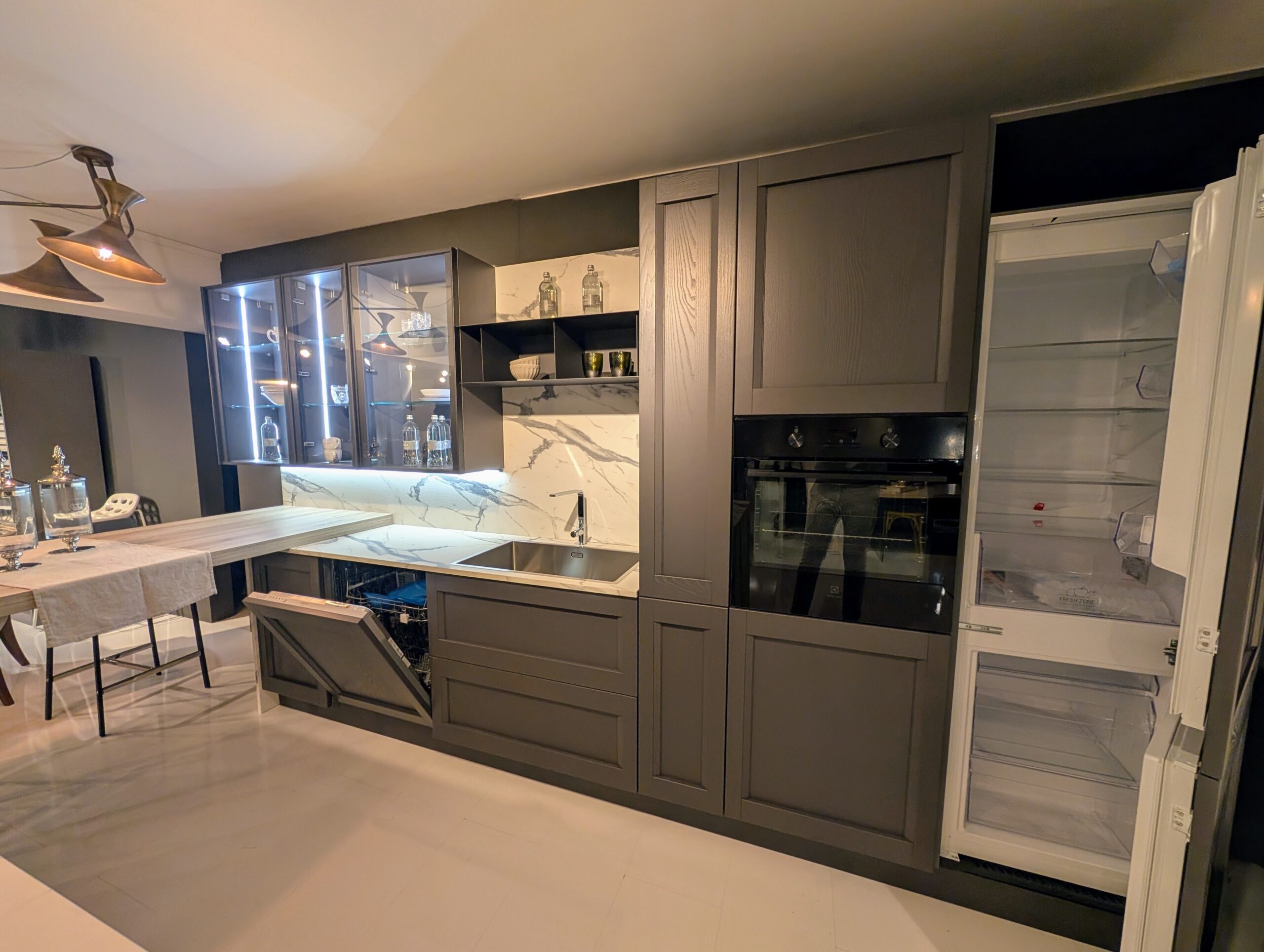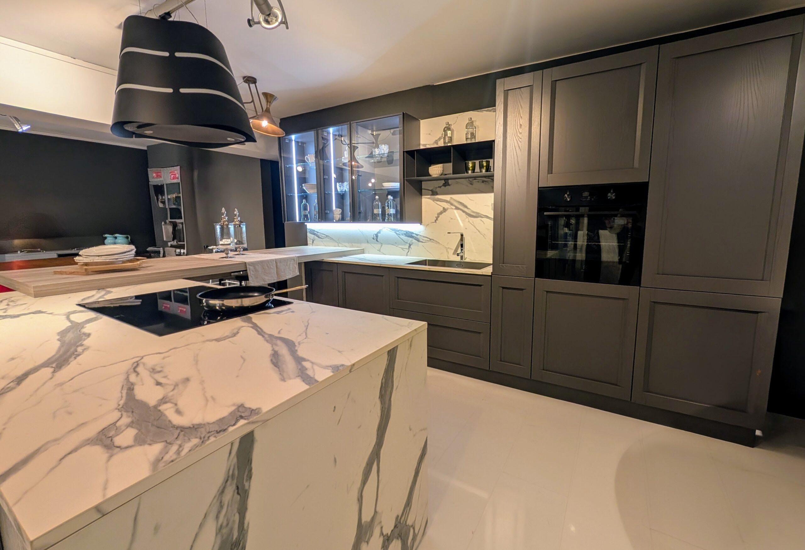 Le ante a telaio in finitura grigio grafite donano una presenza decisa ma sofisticata, mentre i piani di lavoro e gli schienali in gres effetto marmo calacatta creano un prezioso gioco di contrasti cromatici e materici.