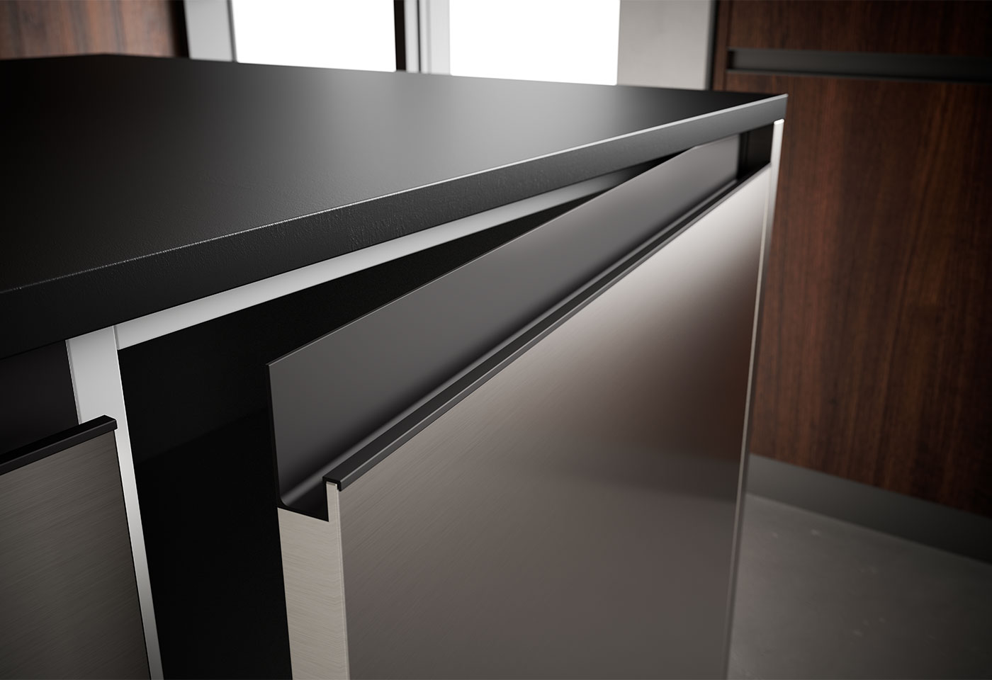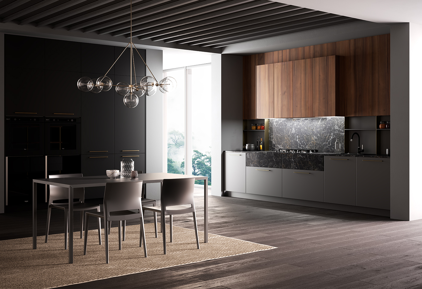 Questo modello di cucina by Confalone offre ben 39 finiture per rendere il vostro spazio come lo avete sempre desiderato. L’effetto inox delle basi e il titanio delle nuove maniglie, dello zoccolo, della libreria e degli elementi a giorno, si affiancano ad un top dalle tonalità calde, per un ambiente personale ed accogliente.