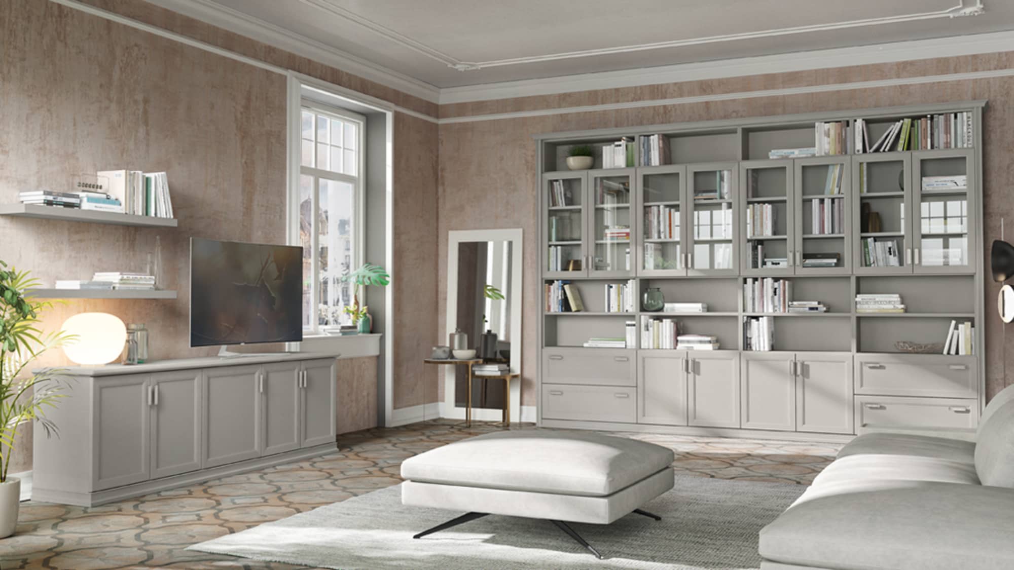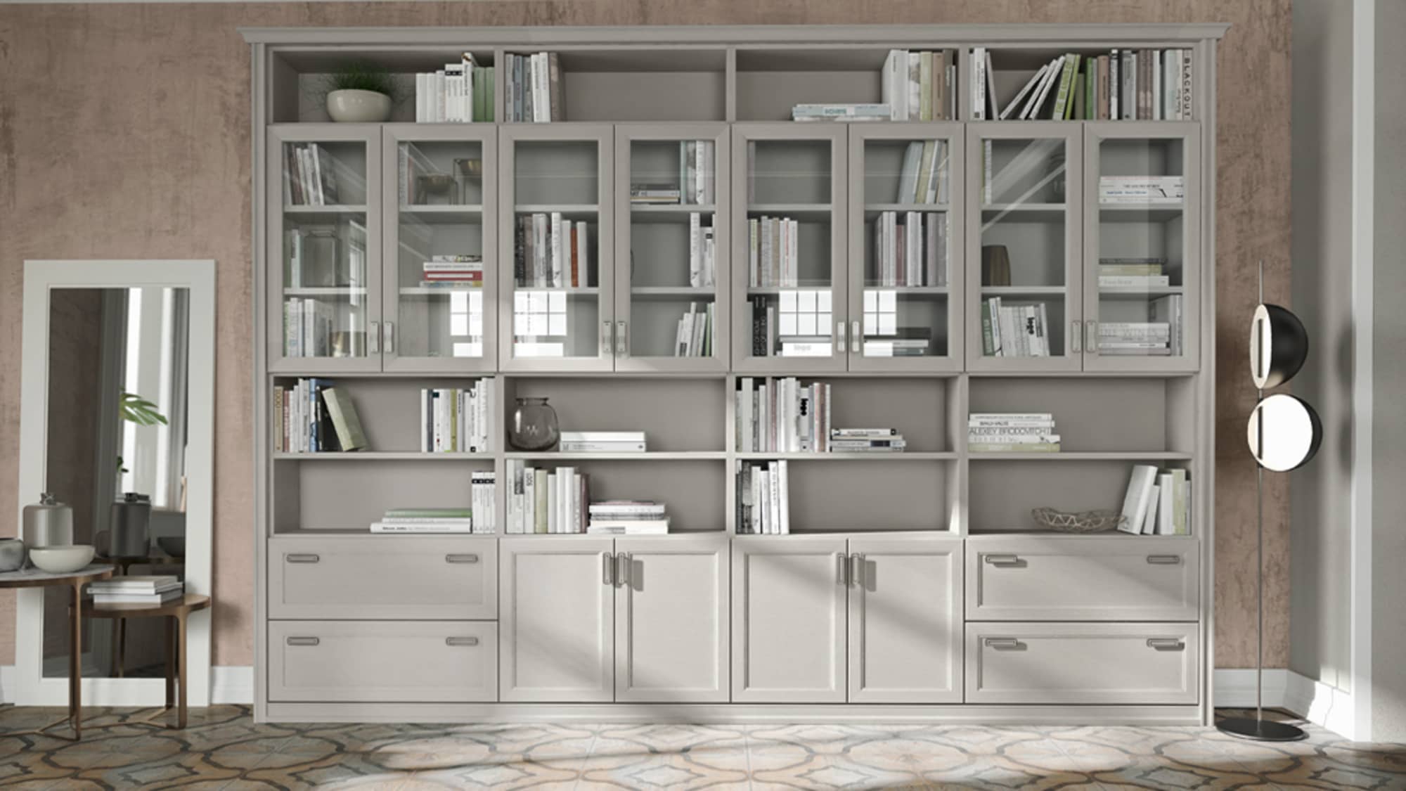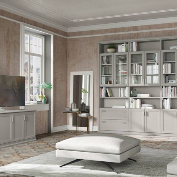 Questa linea di librerie modulari cattura lo sguardo per il suo sapore vintage classic. Gli elementi pieni e vuoti si arricchiscono di ante a giorno che conferiscono una grande eleganza al living.