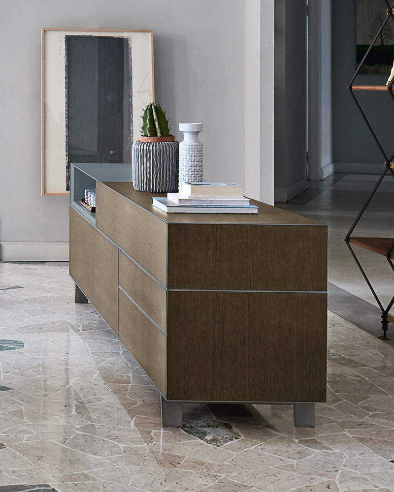 Il gioco di finiture diverse sui frontali dei cassetti, rende unica ed interessante la madia. L’abbinamento dei piedini completa e interpreta il gusto personale.