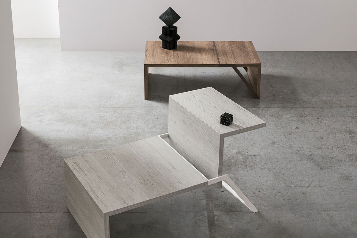 Tavolino da Salotto dal design minimale e dalle prerogative smart. La struttura rettangolare realizzata in laminato e metallo permette al piano sempre in laminato effetto legno di sollevare una parte del top e trasformarsi in un pratico desk