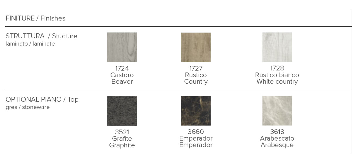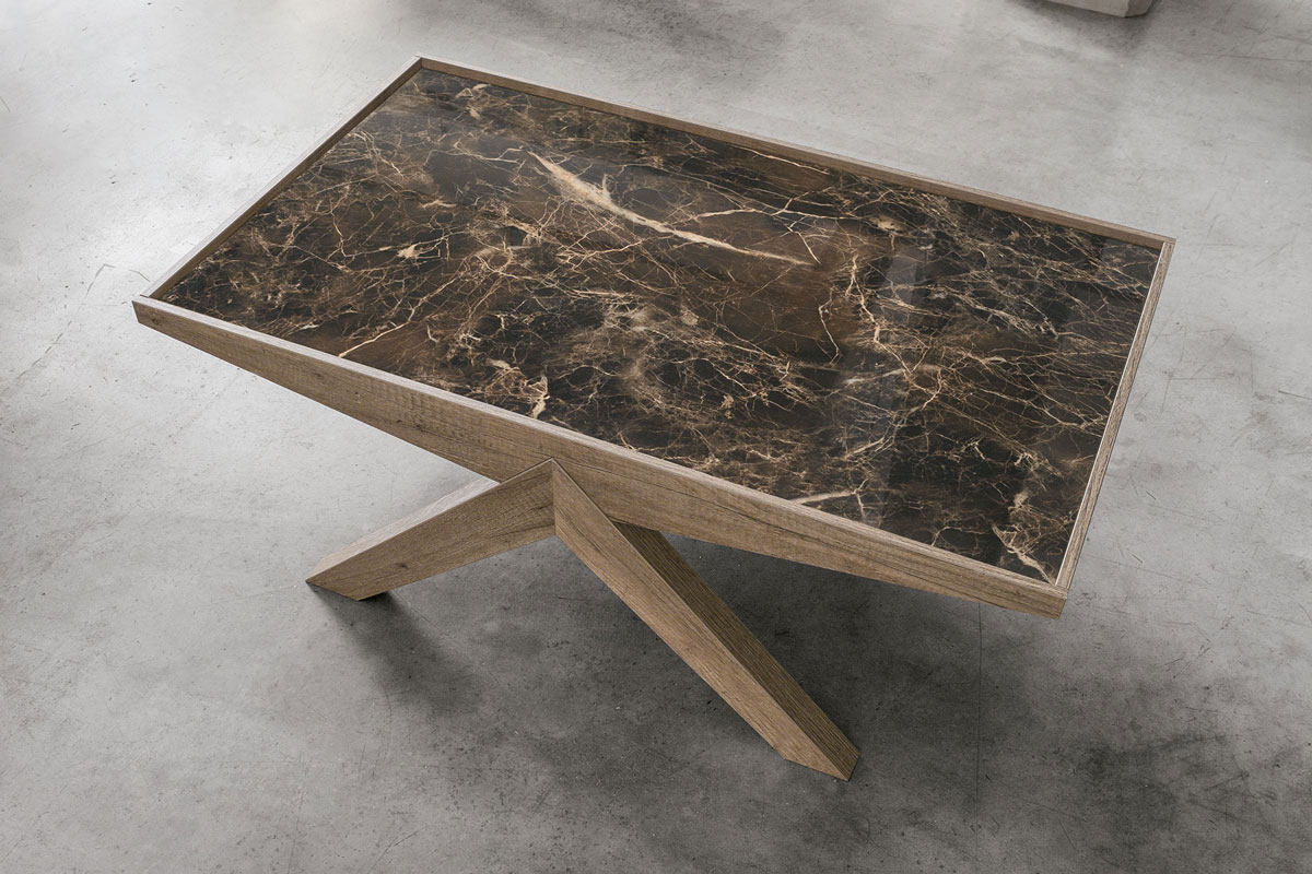 Tavolino da Salotto dal design minimale. La struttura rettangolare realizzata in laminato effetto legno, incornicia un top in gres porcellanato disponibile in diverse varianti.