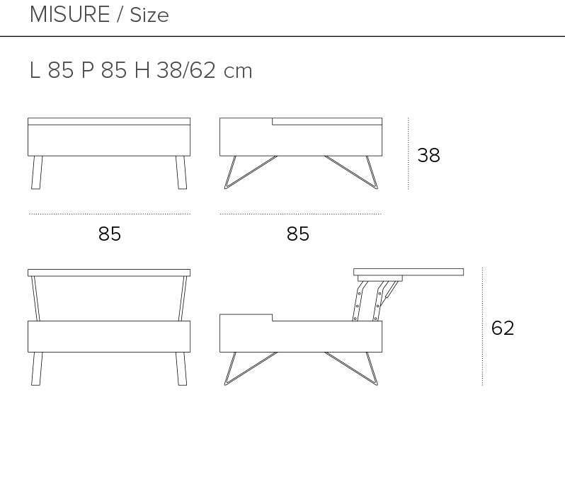 Tavolino da salotto con meccanismo per alzare il piano. Struttura realizzato in Metallo e Laminato e Piano in gres porcellanato. Vano a giorno laterale.