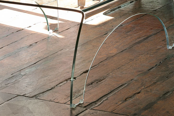 Tavolino da salotto in vetro rettangolare. Questo coffè table si distingue per il particolare design che richiama la forma di un ponte.