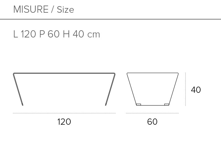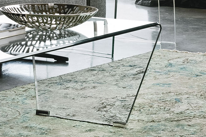 Tavolino da salotto in vetro rettangolare. La curvatura del piano chiude la vista sulla struttura laterale a trapezio.