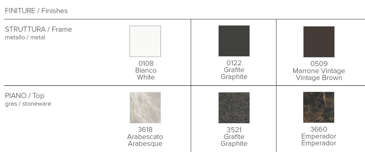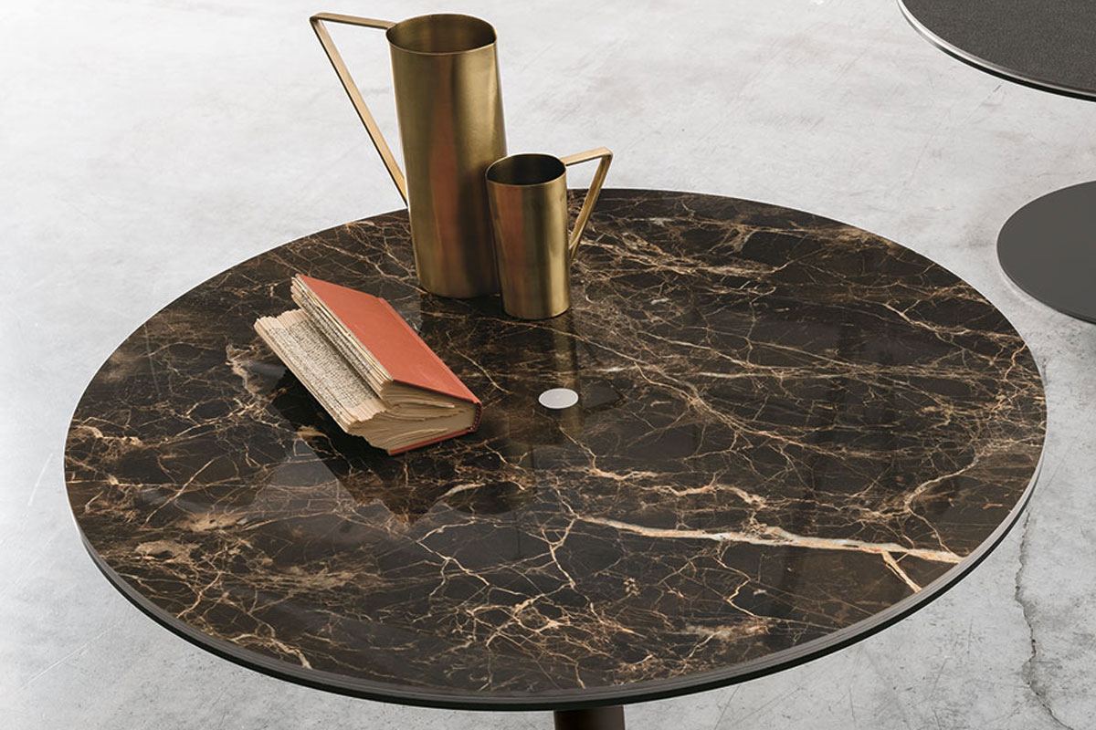 Tavolino da salotto regolabile in altezza. La base di questo tavolino da salotto è realizzata in metallo ed è disponibile in tre varianti di colore. Il top è realizzato in gres porcellanato disponibile in tre varianti.