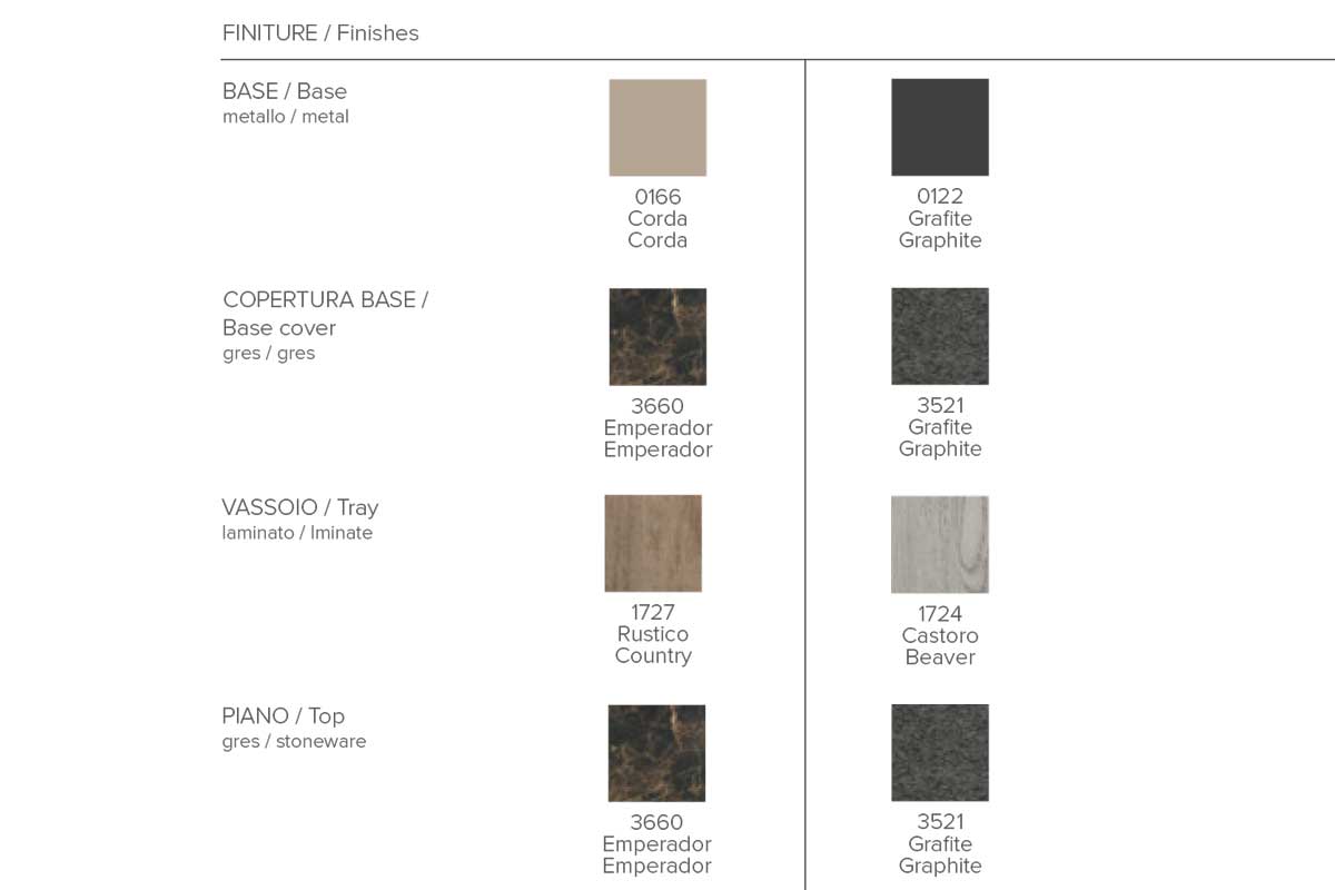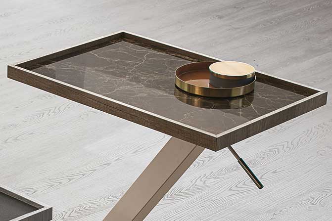 Tavolino da salotto con piano in gres porcellanato. La particolarità di questa serie di coffee table è quella di poter regolare l’altezza tramite un pistone integrato nella struttura in metallo.