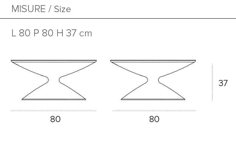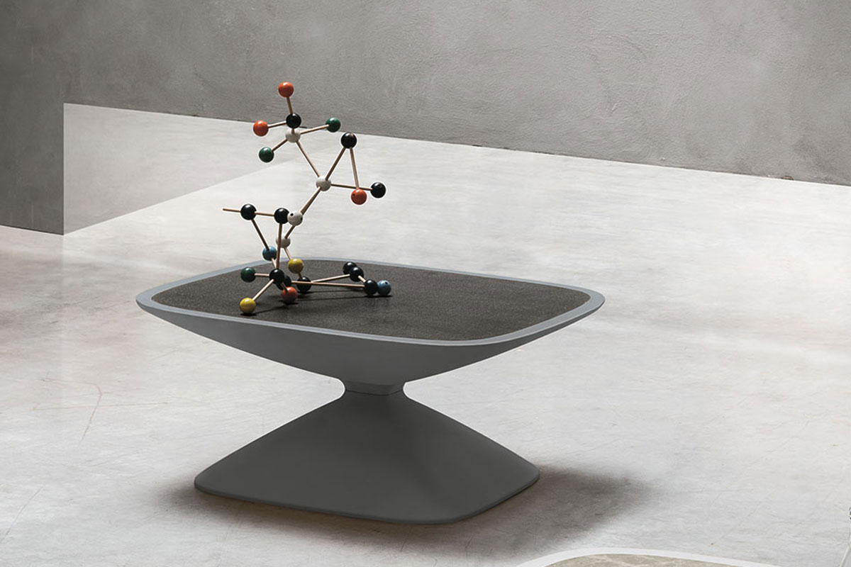 Tavolino da salotto quadrato con bordi stondati e caratterizzato da una affascinante forma a clessidra. La base realizzata in poliuretano viene esaltata da un top in gres porcellanato disponibili in tre diverse varianti.