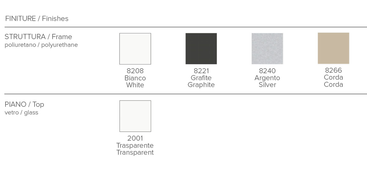 Tavolino da salotto ovale caratterizzato da una ricercata forma a doppia ellissi del della base. La base realizzata in poliuretano viene esaltata dall’eleganza e dalla leggerezza di un top in vetro trasparente.