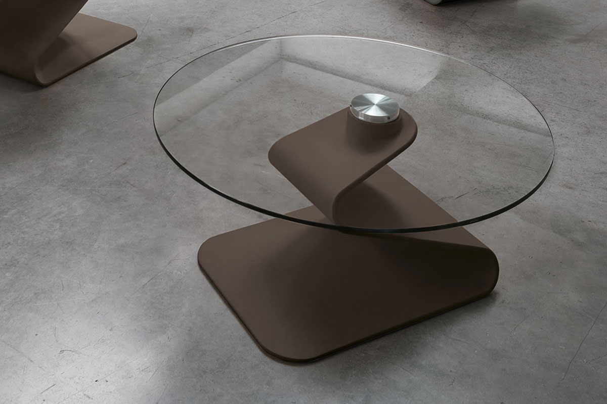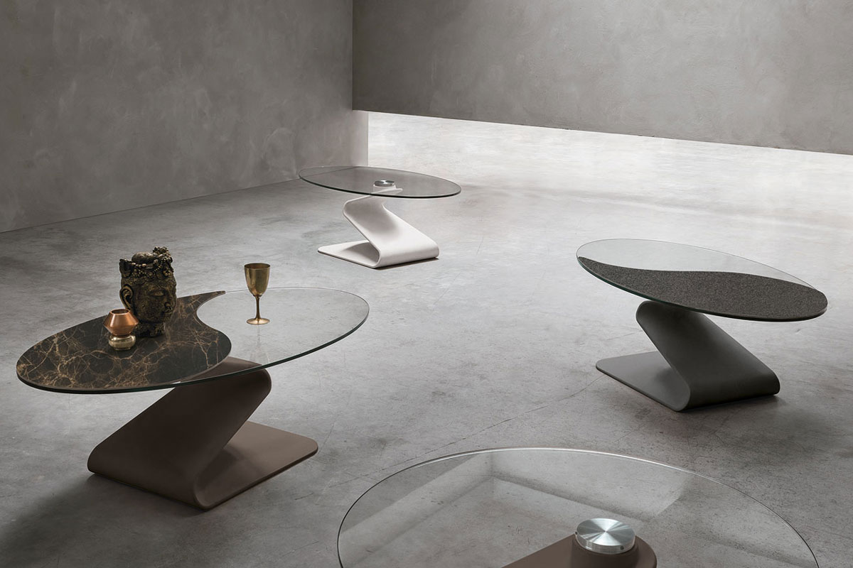 Tavolino da salotto ovale dalla affascinante base realizzata in poliuretano esaltata da un top in vetro temperato o parzialmente abbinato ad un dettaglio in in gres porcellanato