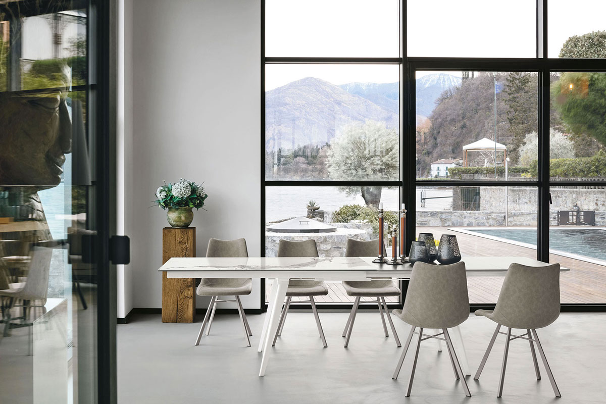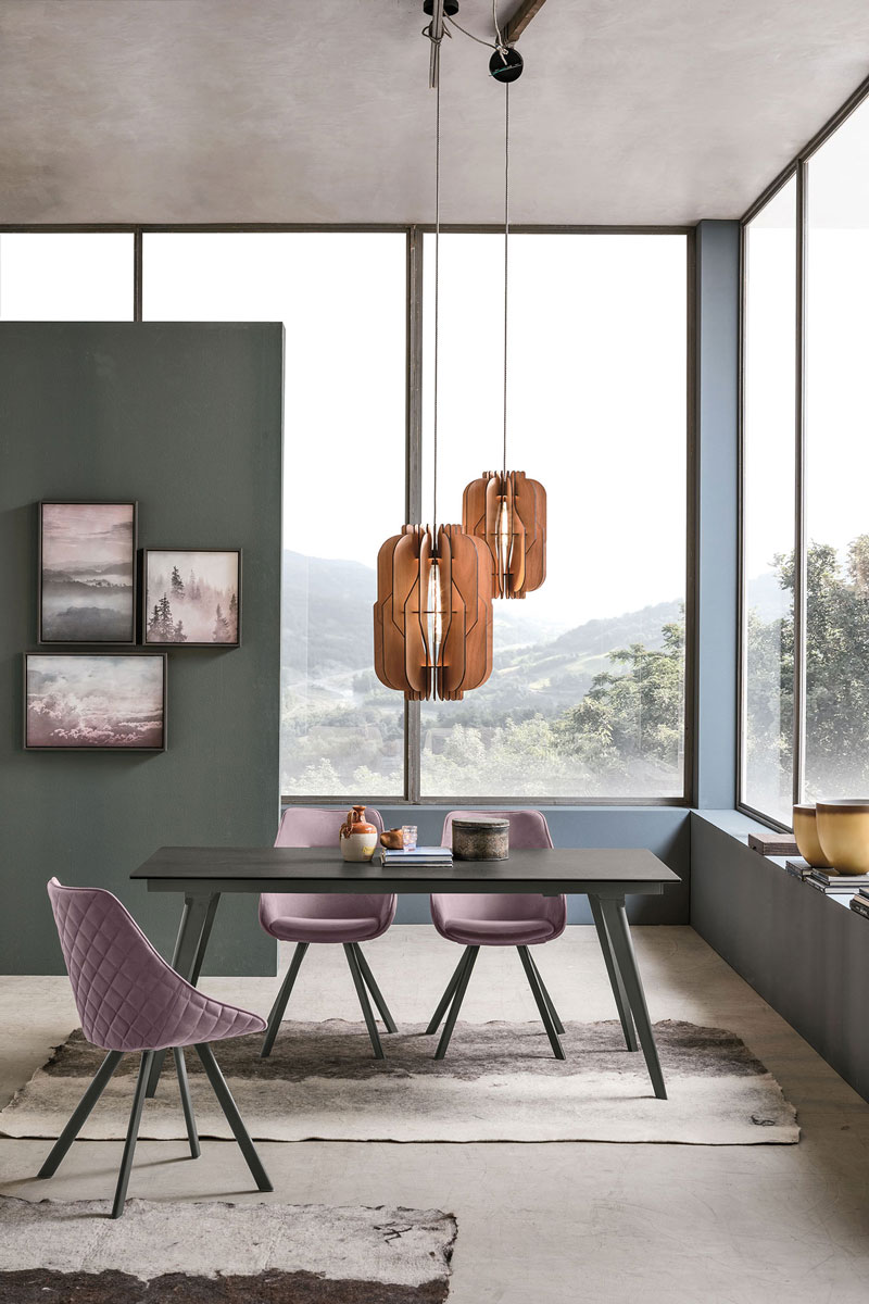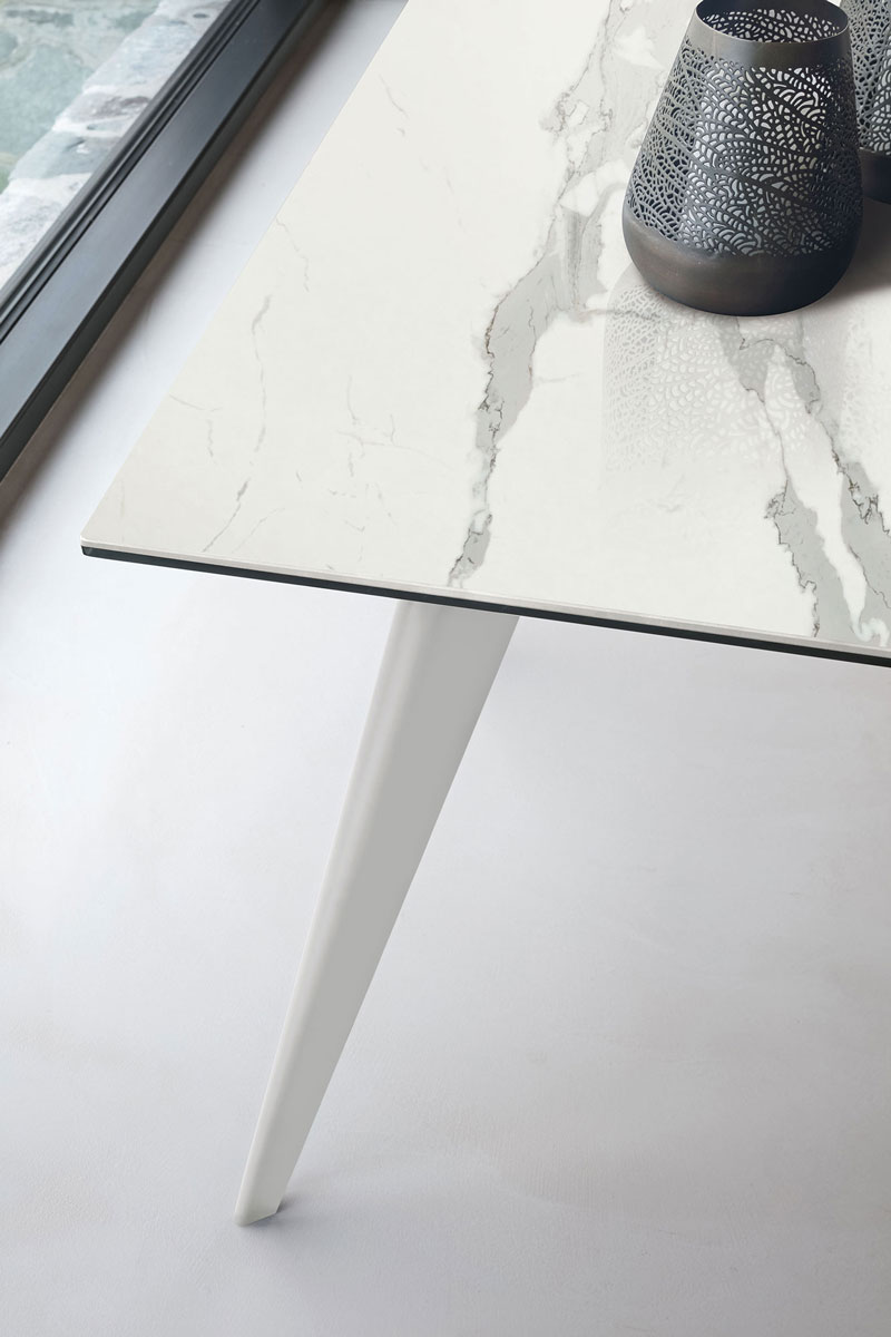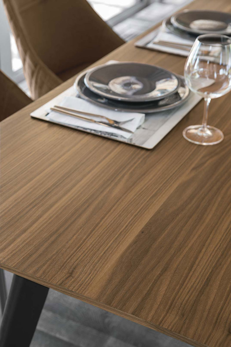 Questo tavolo allungabile by Confalone è disponibile in due dimensioni e due tipologie di materiali: piano ed allunghe in legno impiallacciato oppure piano in gres porcellanato ed allunghe in MDF laccato in tinta con il piano o con la struttura. La struttura è in metallo verniciato o spazzolato.