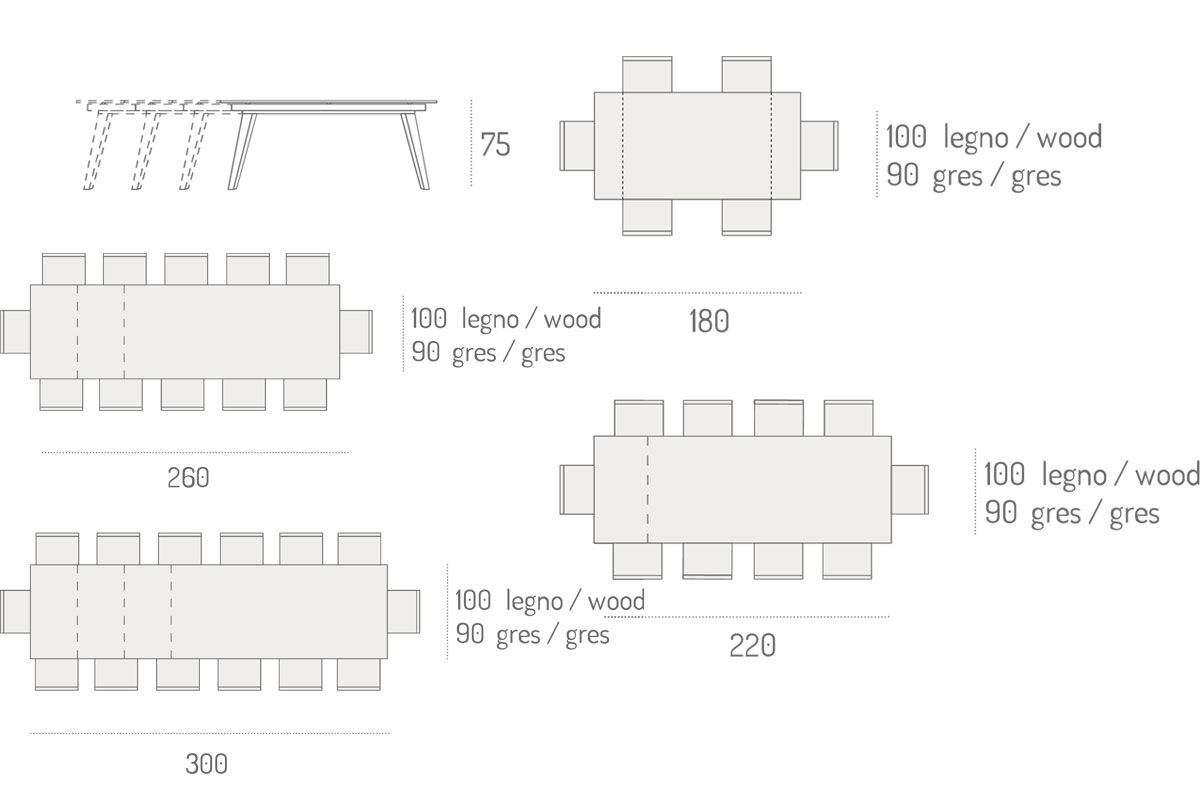 Entrambe le versioni sono disponibili in legno o in gres. Quest’ultima versione ha una profondità ridotta di 90 cm, invece dei 100 cm della versione in legno, ed allunghe in tinta in materiale MDF.