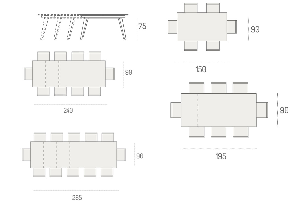 Il modello da 180 cm ha 3 allunghe da 4o cm che permettono un facile estensione per ogni esigenza. Stesso concept per la versione da 150 cm che ha però 3 allunghe da 45 cm e raggiunge l’estensione massima di 285 cm.
