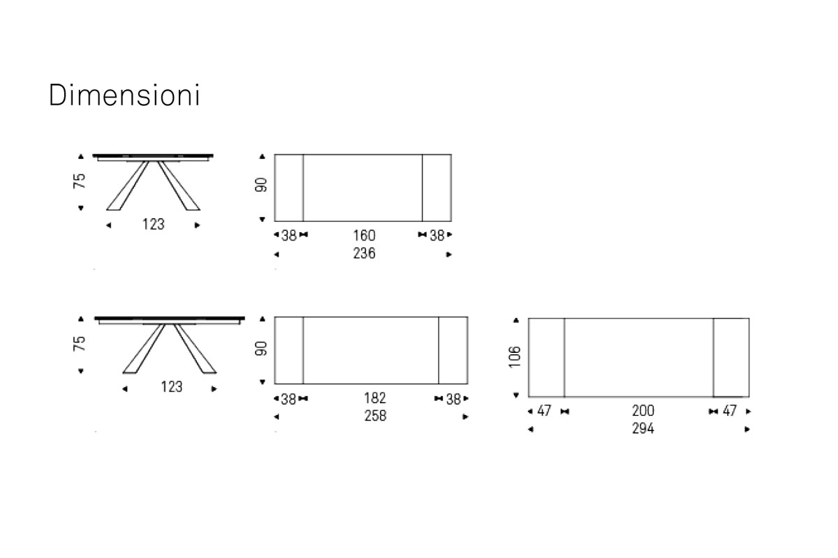 Questo modello di tavolo da pranzo allungabile è disponibile in tre dimensioni con allunghe da 38 cm e 47 cm nella versione da 200 cm. Tutti i vetri, sia temperati che non, hanno caratteristiche di sicurezza tali da corrispondere ai requisiti richiesti.