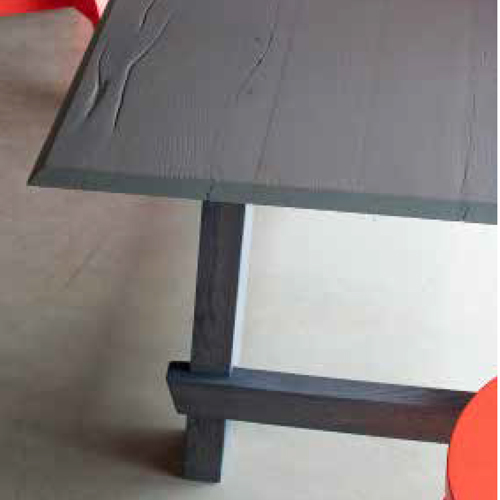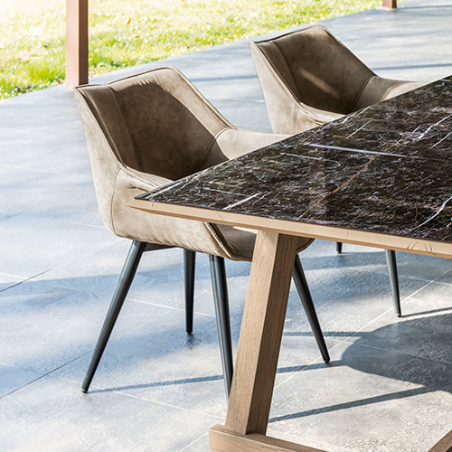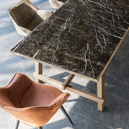 Disponibile in tre dimensioni questo modello è a schema fisso. Il piano ha uno spessore di 3,3 cm e permette di scegliere il top in vetro tra nove esclusive varianti.