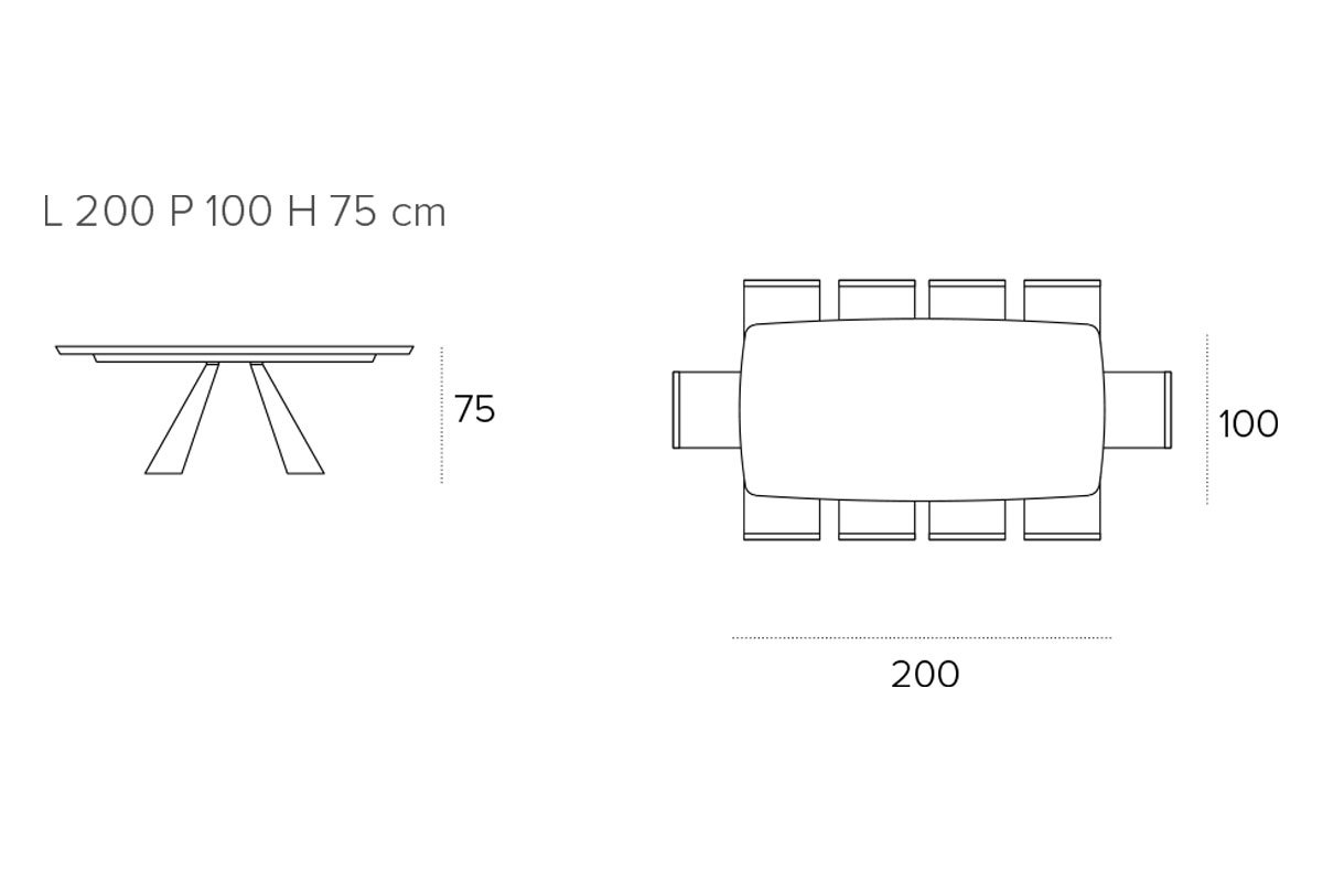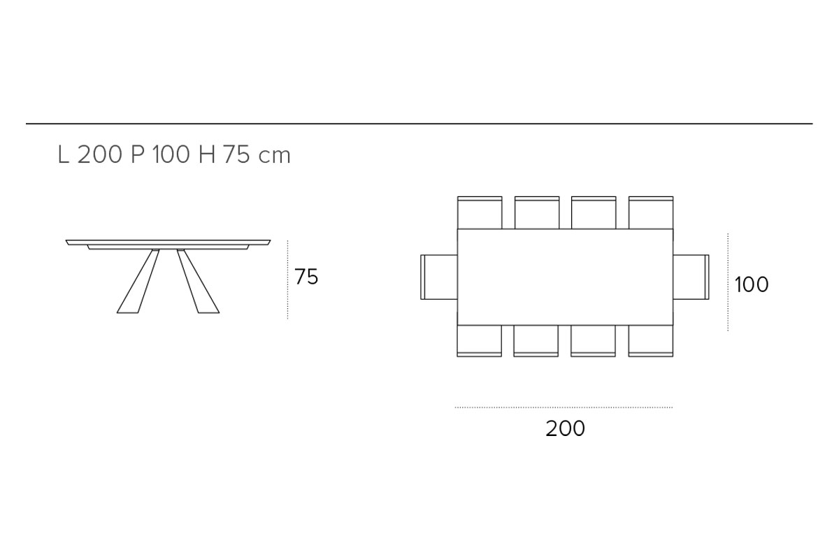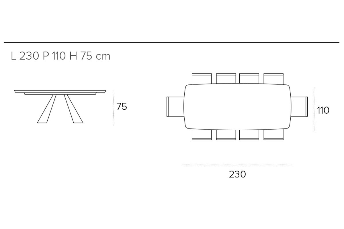 Il tavolo fisso da 230 cm in legno impiallacciato è disponibile rettangolare o a botticella. La struttura è in metallo verniciato. La versione con il mentre il piano in gres porcellanato è disponibile nella sola variante a botticella. In questo modelli il piano in gres è realizzato con uno spessore maggiorato per aumentare la resistenza agli urti e al carico massimo concesso.