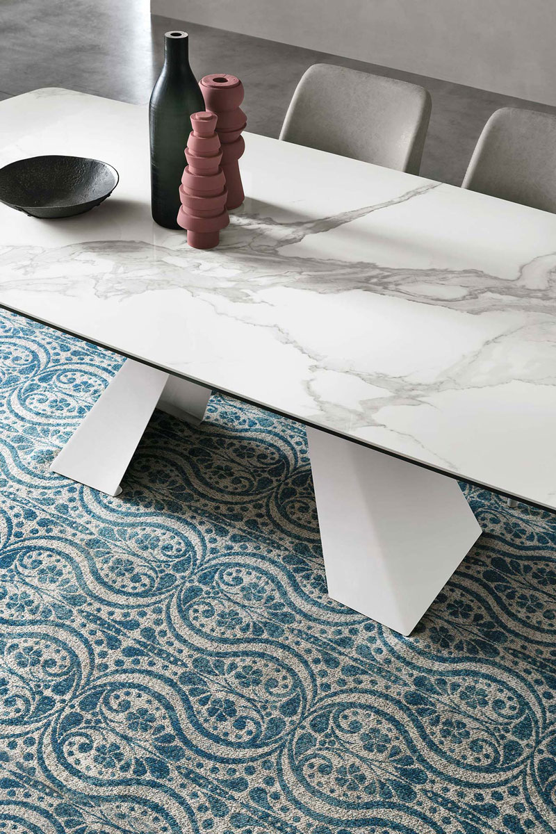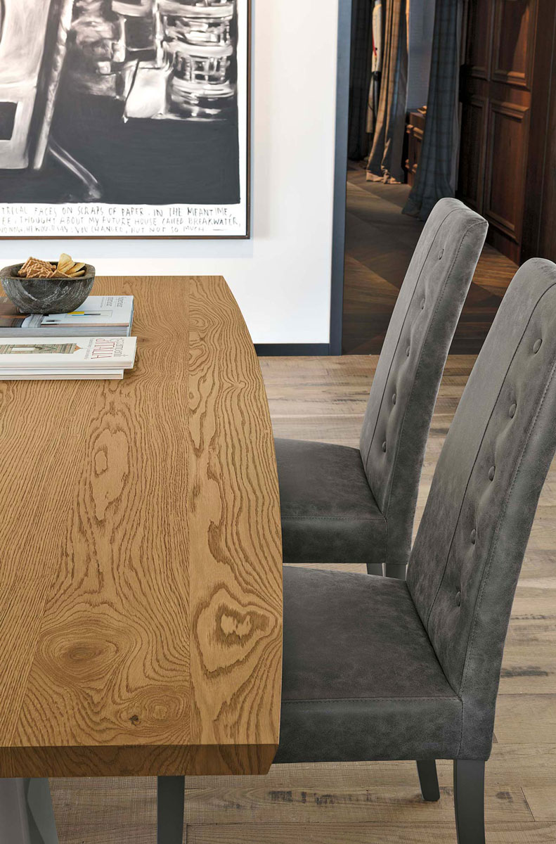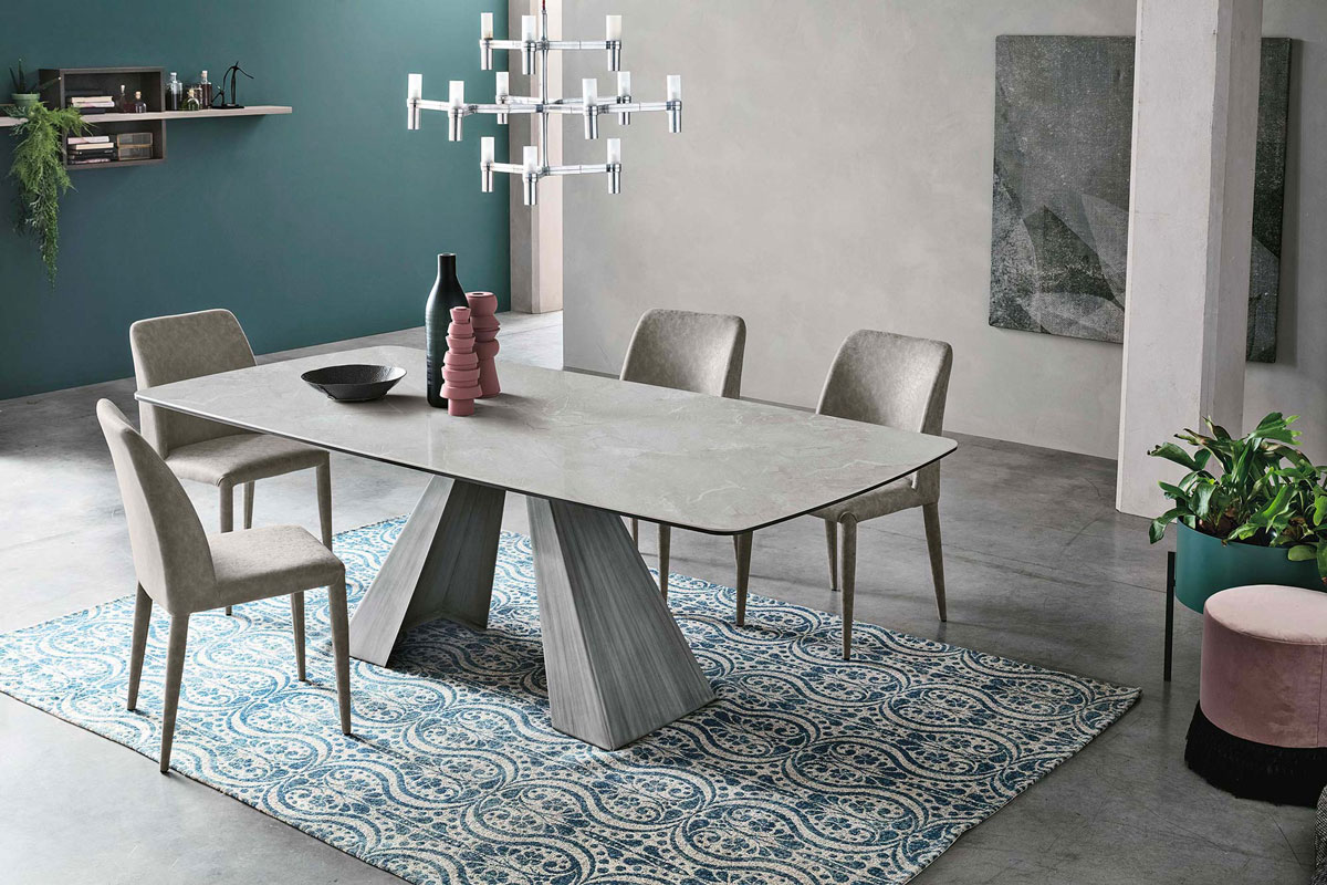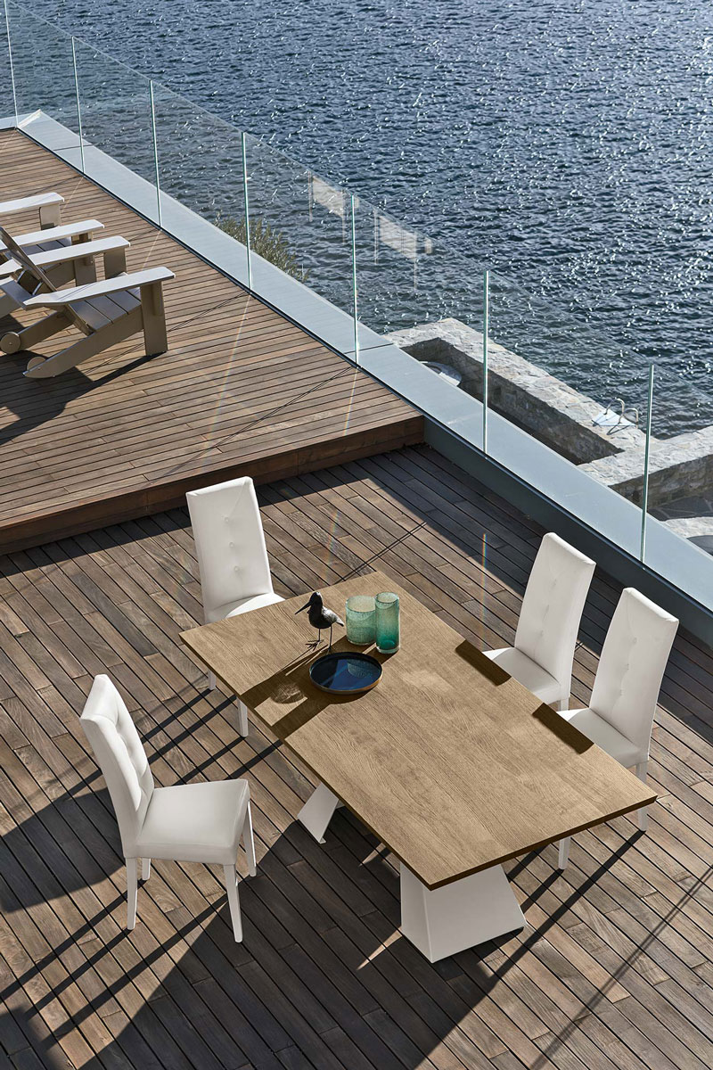 Il tavolo fisso da 230 cm in legno impiallacciato è disponibile rettangolare o a botticella. La struttura è in metallo verniciato. La versione con il mentre il piano in gres porcellanato è disponibile nella sola variante a botticella. In questo modelli il piano in gres è realizzato con uno spessore maggiorato per aumentare la resistenza agli urti e al carico massimo concesso.